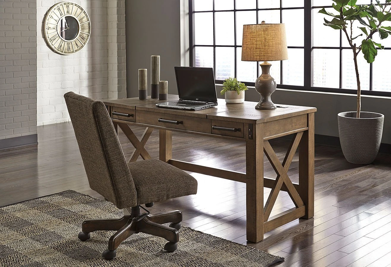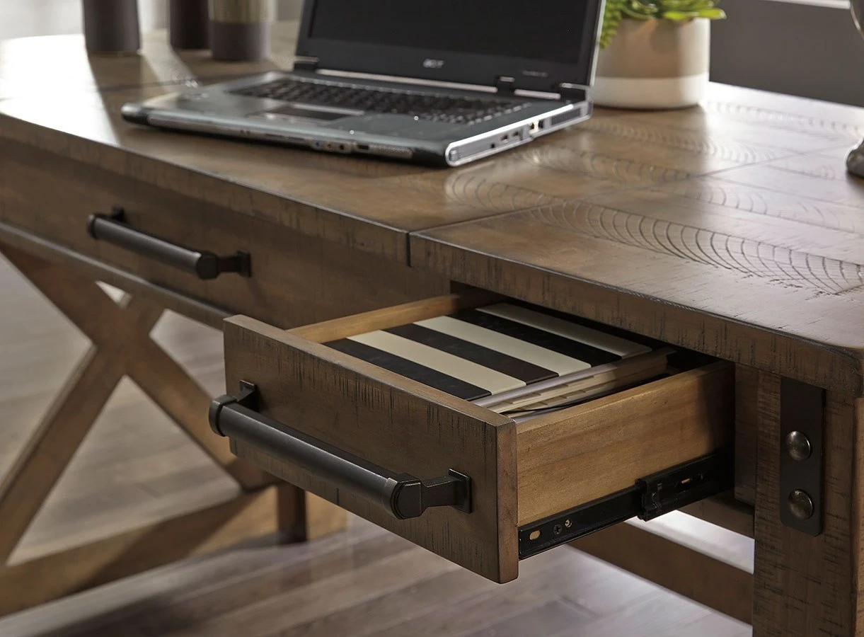 - OverviewCrafted with pine veneers and wood treated to a distressed gray finish, the Aldwin lift top desk by Signature Design is rustic farmhouse living at its best. Crossbuck styling adds striking flair, while metal industrial brackets incorporate an industrial twist. Elevating the functionality of this lift top desk all the more: two smooth-gliding drawers and conveniently placed AC power/USB plug-ins.