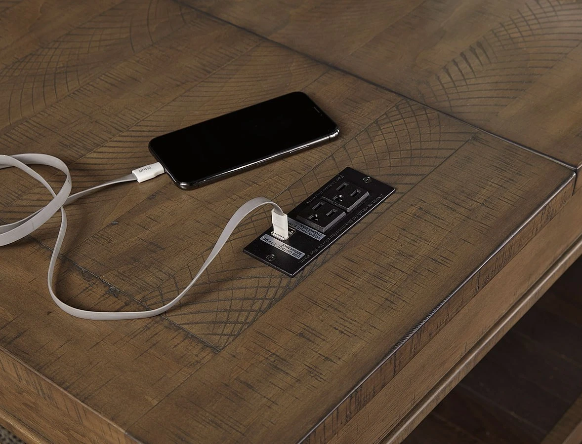 - OverviewCrafted with pine veneers and wood treated to a distressed gray finish, the Aldwin lift top desk by Signature Design is rustic farmhouse living at its best. Crossbuck styling adds striking flair, while metal industrial brackets incorporate an industrial twist. Elevating the functionality of this lift top desk all the more: two smooth-gliding drawers and conveniently placed AC power/USB plug-ins.