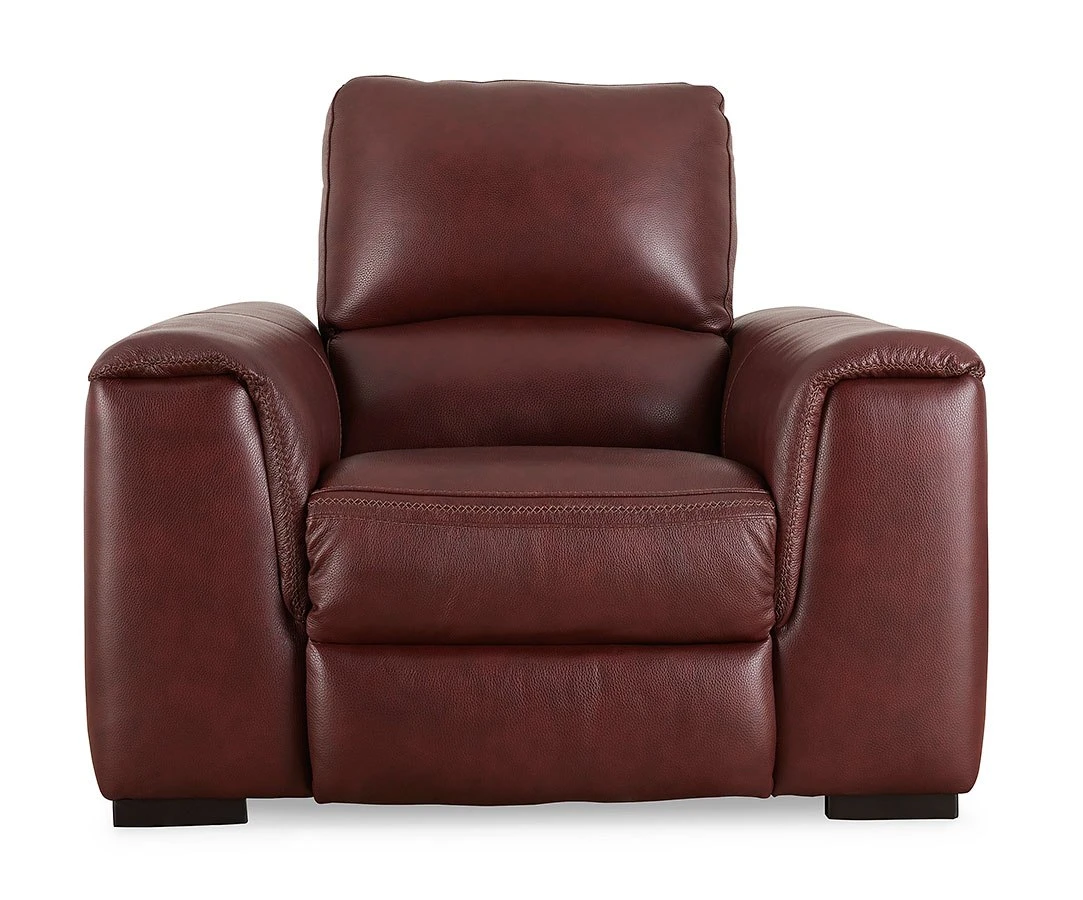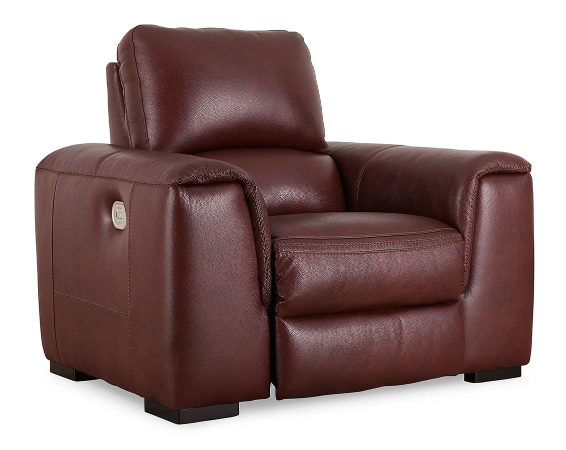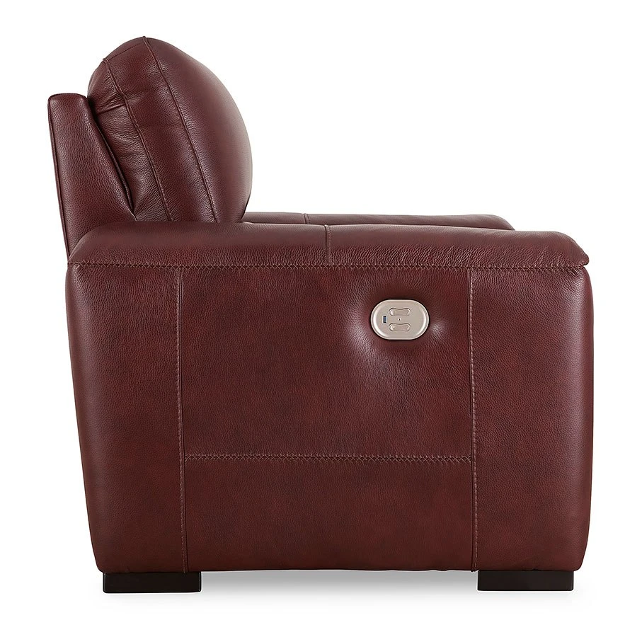 - OverviewImpressive in scale while keeping an air of refinement, this Alessandro power recliner by Signature Design stuns with soft, supple leather match upholstery in garnet. Sink into real leather in the seating area and inside back while catering to your comfort with one-touch power reclining and an adjustable headrest. Complete with USB charging, this recliner makes a surefire statement in your contemporary living room.