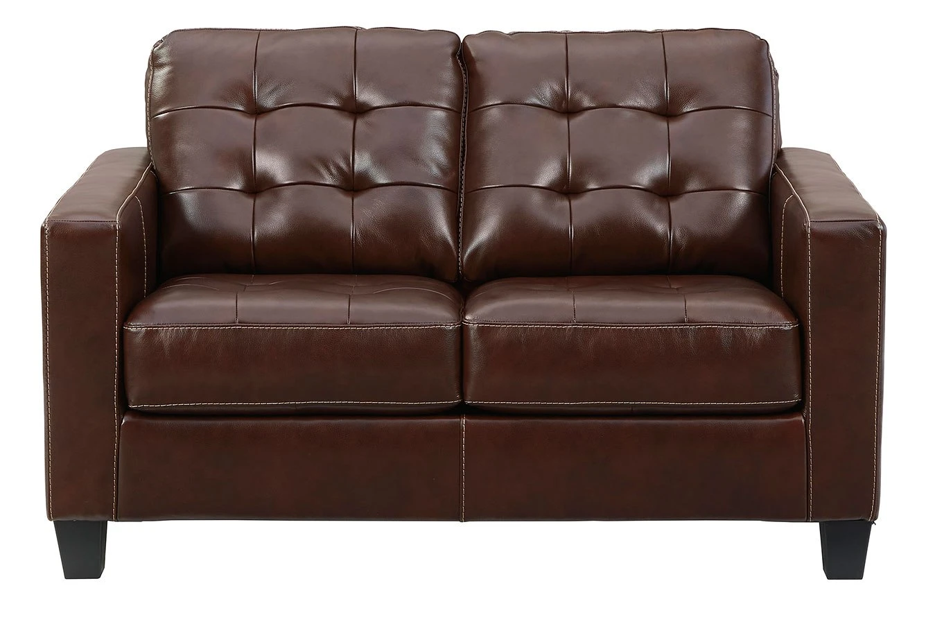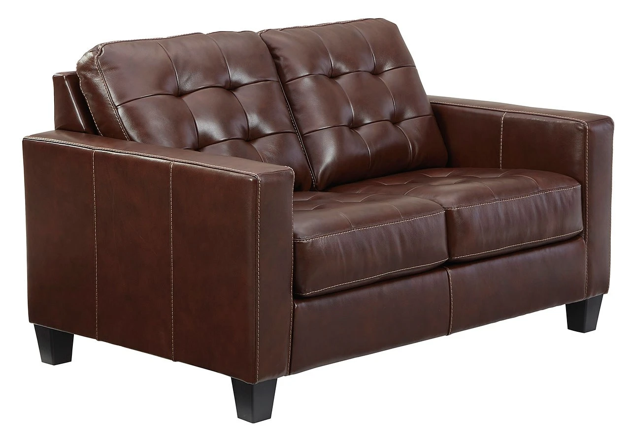 - OverviewTailor your space with the tidy structure of this Altonbury loveseat by Signature Design. Decorative stitching and button tufting on the box cushion make for a very neat appearance. With real leather covering the seating area – where it matters most – this piece has skillfully matched leather elsewhere, so you won’t get hemmed in by the price.