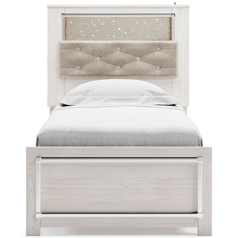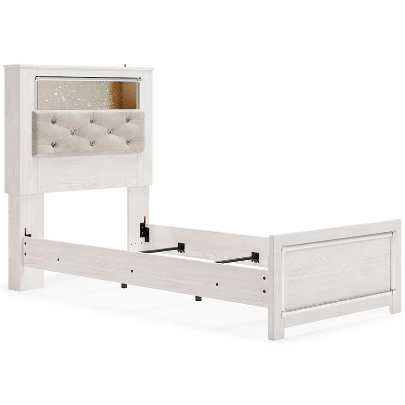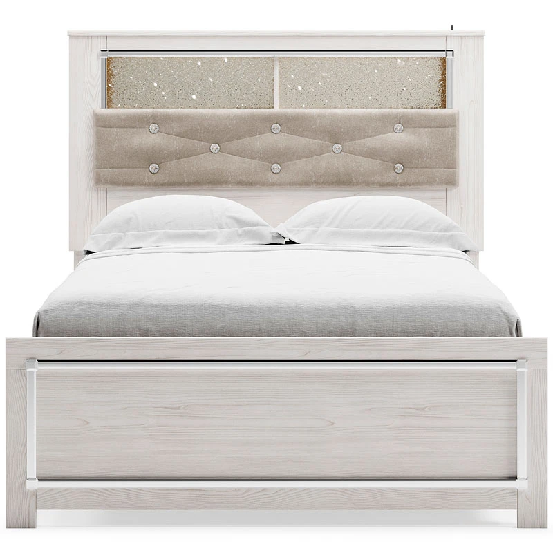 - OverviewThe epitome of fashion-forward design, this Altyra upholstered bookcase bed by Signature Design is a beautiful blend of comfort and luxury. Shiny chrome-tone accents, a pearlized finish and button-tufted upholstery bring a glam touch to the richly rustic appearance. Remote-controlled LED lighting adds style and modern convenience to your restful retreat.