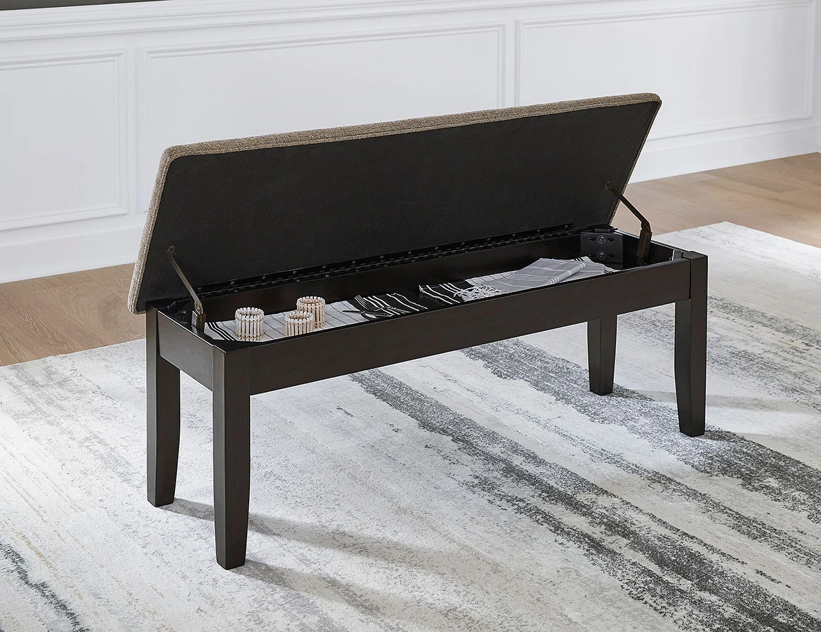 - OverviewThe perfect place for linens, seat cushions and special occasion accents, this Ambenrock storage bench by Signature Design satisfies your appetite for great form and function. This bench is crafted with a dark brown finish and a cushioned seat in light chestnut brown woven fabric.