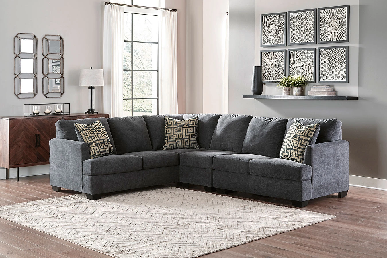 - OverviewThis Ambrielle 3-Piece Sectional by Signature Design makes a stylish statement in modern design. Velvety soft upholstery is love at first touch, and its stunningly simple look is right at home in contemporary decor. The neutral gunmetal hue blends easily with any color scheme. Patterned accent pillows in complementary colors add bold contrast and a soft touch.