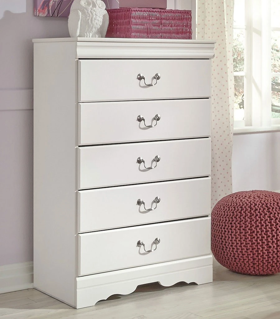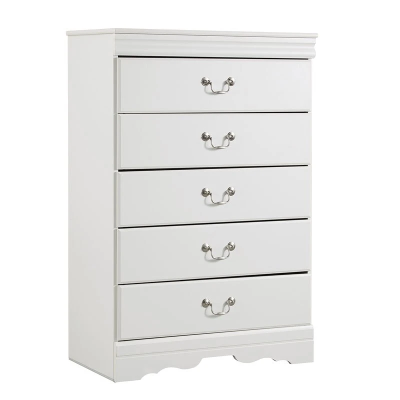 - OverviewTraditional in design and modest in scale, the elegant Anarasia Bedroom Collection by Signature Design takes its design inspiration from the classic Louis Philippe styling. The group features replicated white paint, shapely top mouldings on the case pieces, antiqued pewter color metal hardware and curvaceous footboard panel, caped with an elegant sleigh rail.