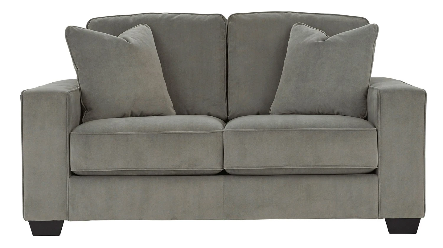 - OverviewServing up a refined, upscale look – at an incomparable value price – this Angleton loveseat by Signature Design lures from every angle. Crisp, 2-over-2 cushion design, wide track arms and black tapered feet lend a clean, contemporary aesthetic. Velvety soft upholstery in a chic sandstone gray upholstery takes neutral to another level. Matching feather-filled throw pillows master the art of minimalism.