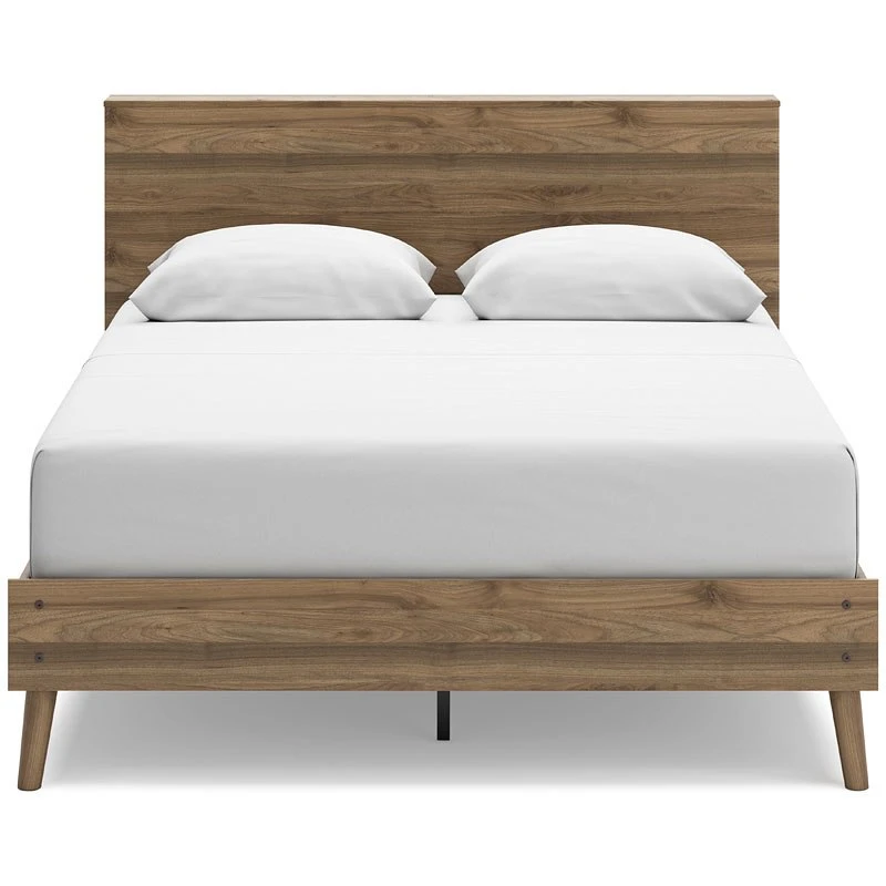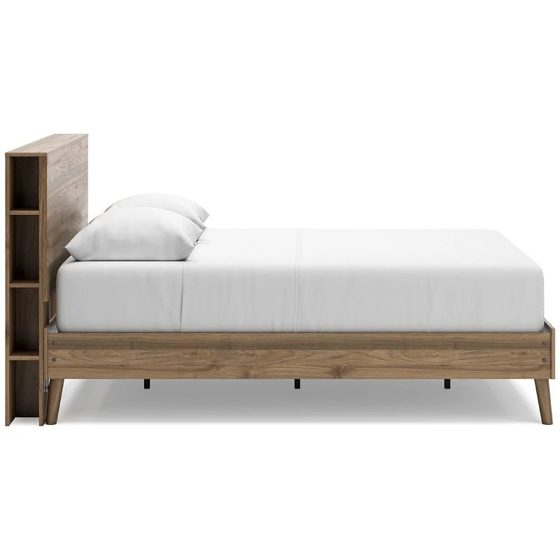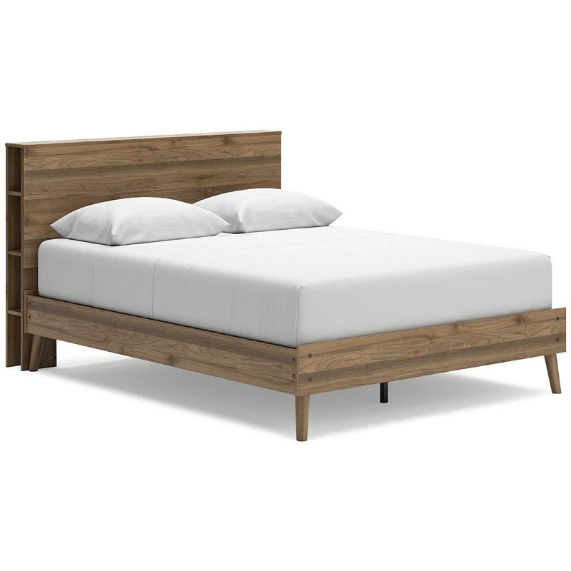 - OverviewDare to take minimalism to the max. This Aprilyn Bookcase Bed by Signature Design has a richly relaxed feel thanks to its honey brown finish over replicated wood grain. A space-efficient storage option, cubbies along the side of the headboard ensure you can keep your favorite reads within reach. USB charging keeps up with your high-tech lifestyle. There’s no doubt about it: This contemporary piece is sure to become a classic.