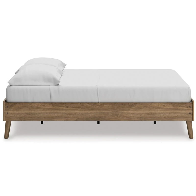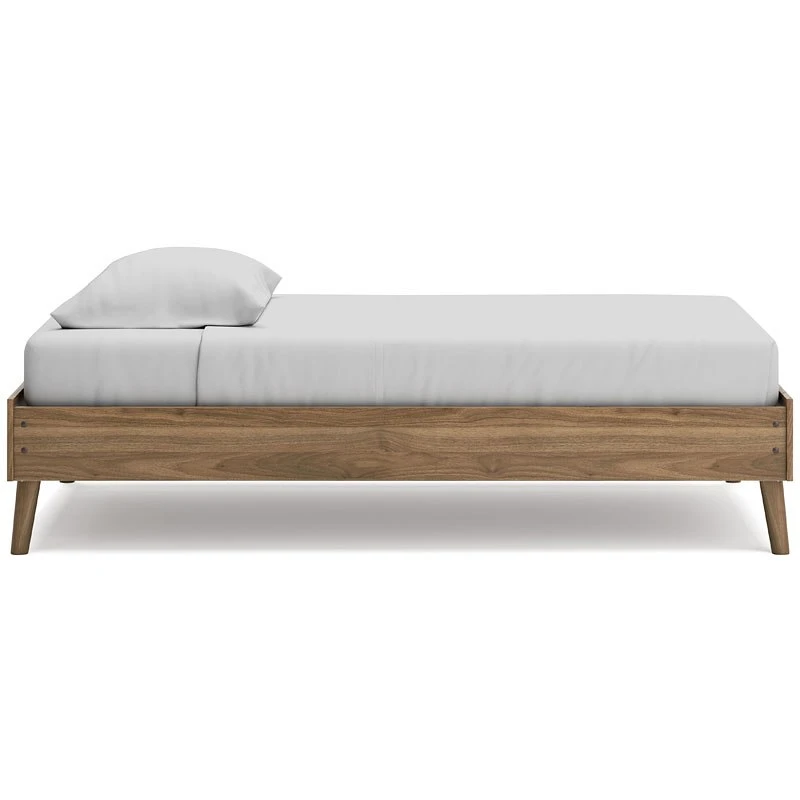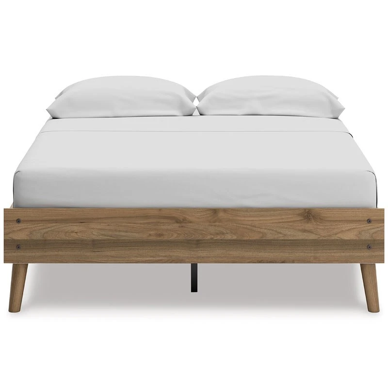 Dare to take minimalism to the max. This Aprilyn Platform Bed by Signature Design has a richly relaxed feel thanks to its honey brown finish over replicated wood grain. Magnificently mod splay legs are a compelling complement to the streamlined design. There’s no doubt about it: This contemporary piece is sure to become a classic.