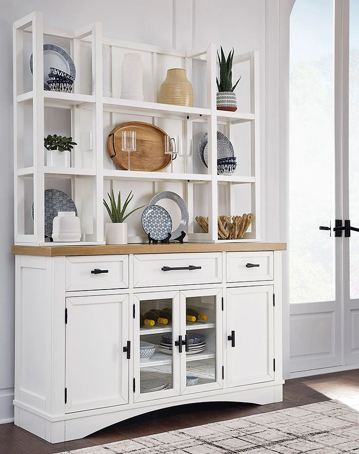 - OverviewThis Ashbryn Server w/ Hutch by Signature Design delivers casual style with substance. A classic white finish and butcher block oak veneer top add a relaxed vibe to a delicious design that exudes a modern farmhouse aesthetic. Cabinets, drawers and open shelves provide ample storage and display space for dining essentials and decor. This charmingly curated piece is a show of great taste.