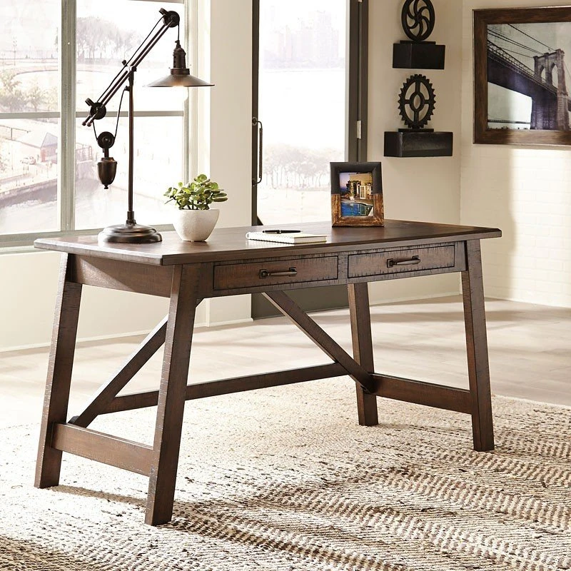 - OverviewThe Baldridge Home Office Set by Signature Design is made with Acacia veneers and select hardwood solids in a warm brown with subtle saw kerf distressing. Leg desk has canted base and two drawers for storage. The richly upholstered swivel desk chair with striking high-back design and armrests makes work so much more comfortable. Set on casters, it beautifully goes with the flow.
