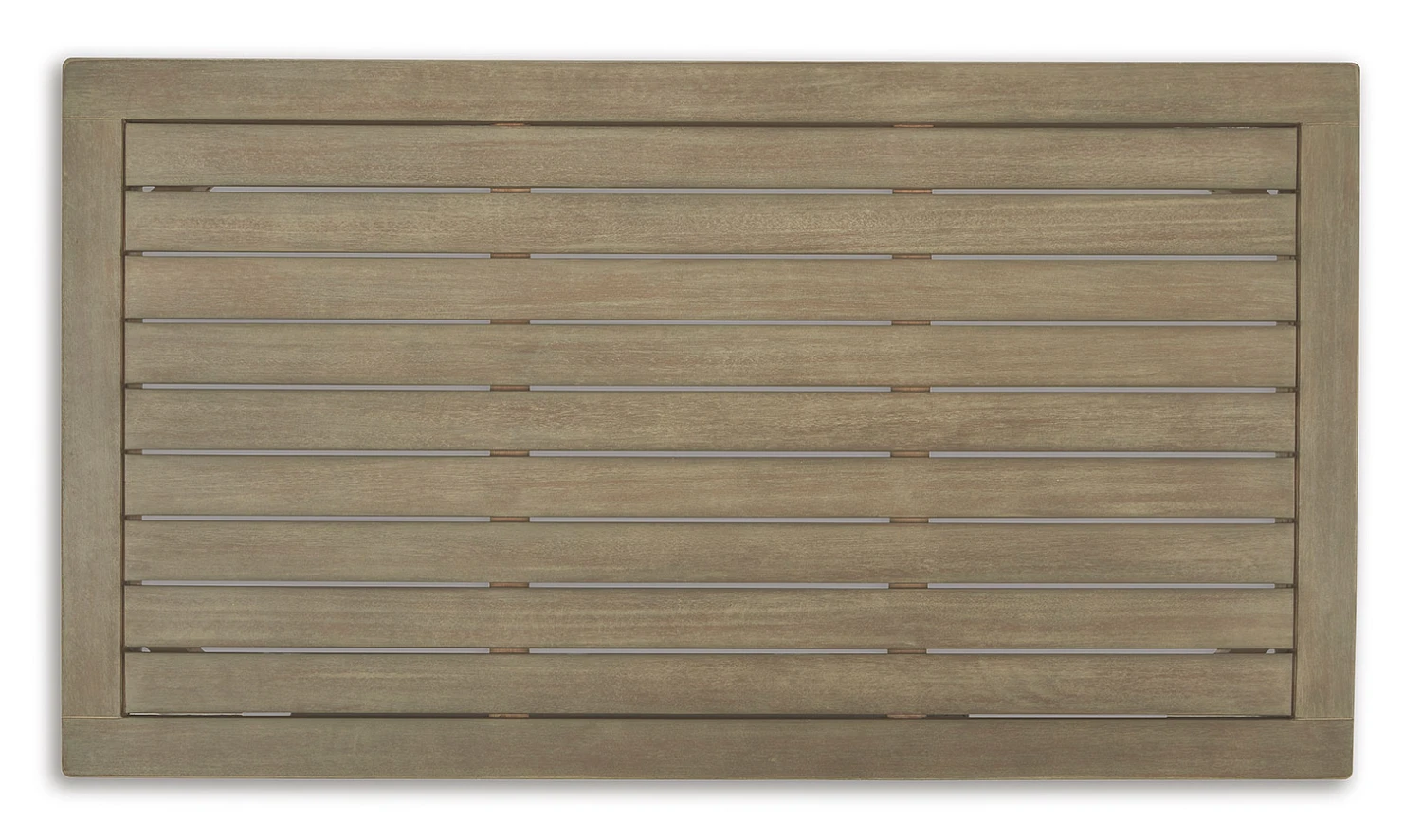 - OverviewYou’ve got it made in the shade with this Barn Cove outdoor coffee table by Signature Design. Made of eucalyptus wood with a slatted design to prevent rainwater buildup, this piece has a rustic charm and is built to last.
