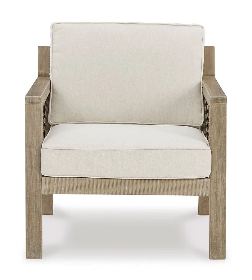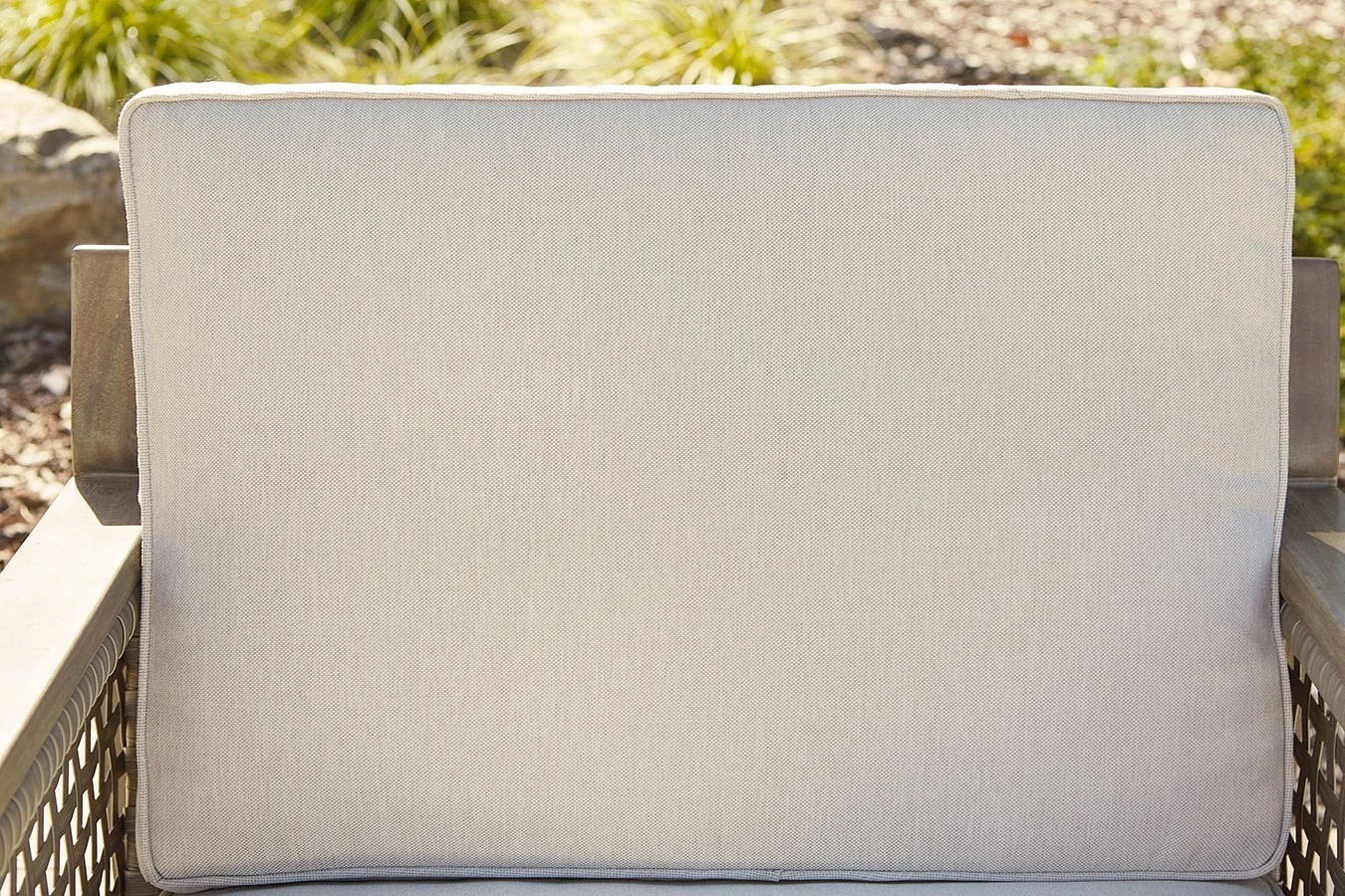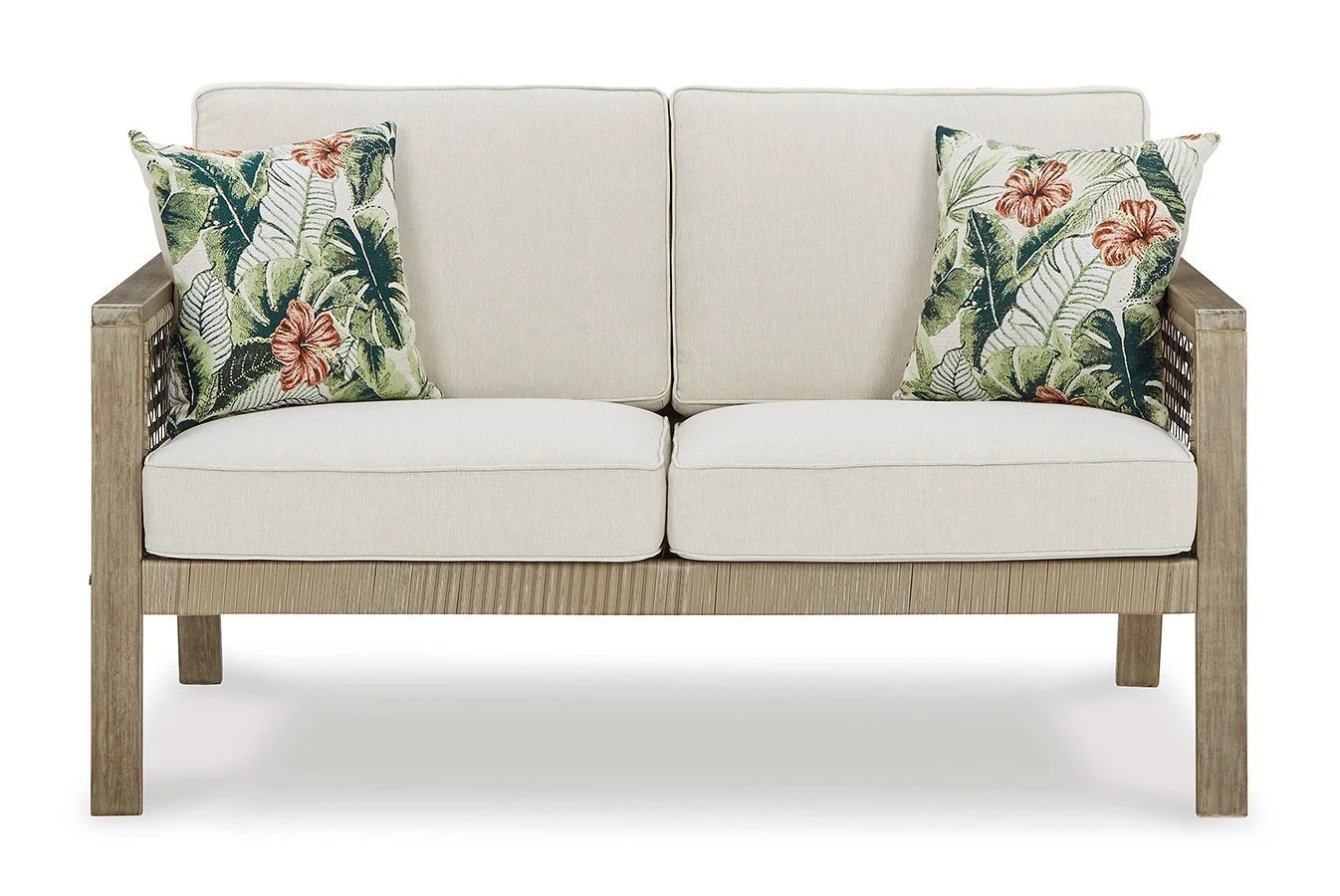 - OverviewYou’ve got it made in the shade with this Barn Cove Outdoor Seating Set by Signature Design. Made with eucalyptus wood, the loveseat’s seat, back and sides are woven of durable resin wicker. The tan cushion is wrapped in easy-clean Nuvella fabric, which stands up to harsh weather for season after season of enjoyment. Two floral throw pillows add a splash of color.