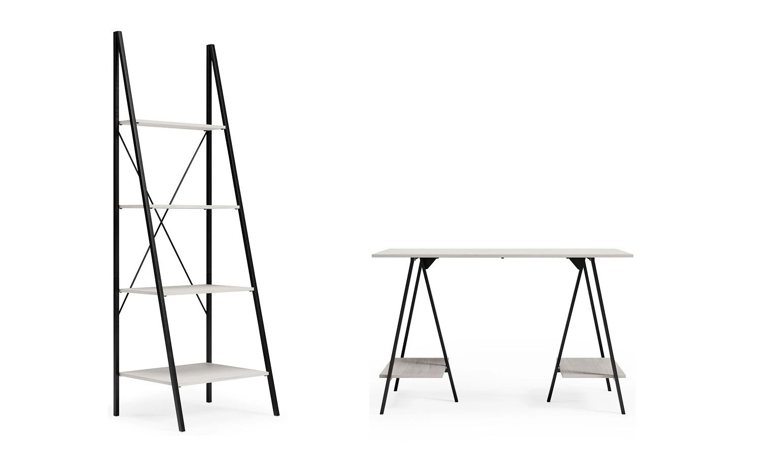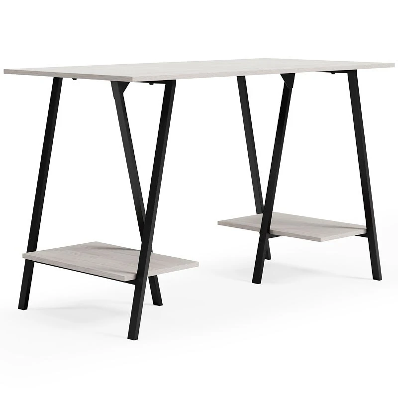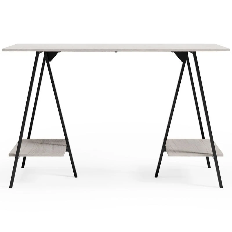 - OverviewLove an urban farmhouse aesthetic? Make it work to your advantage with this beautifully styled Bayflynn home office desk by Signature Design. A simply striking choice in home office furniture, it has an unmistakable farmhouse feel thanks to a whitewashed finish and gunmetal accents. This minimalist-chic desk with open storage shelves and sawhorse legs gives you plenty of options when working on homework, doing art projects, or just relaxing.