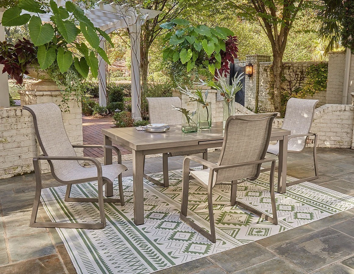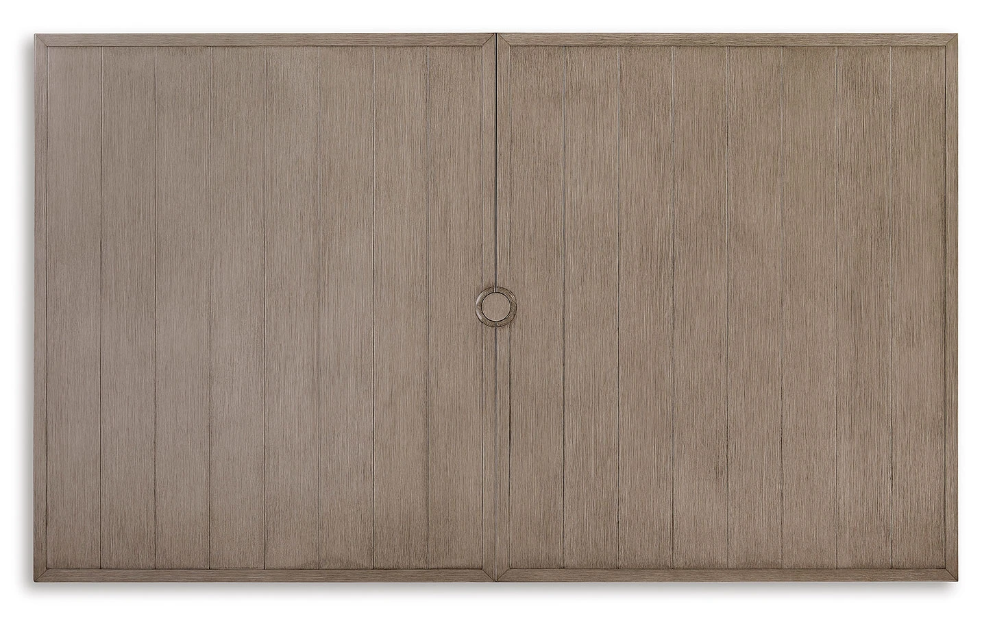- OverviewBalancing effortless natural beauty and minimalist design, this Beach Front Outdoor Dining Set by Signature Design seamlessly brings your contemporary style outdoors. Sporting a wood-look finish, it entices with an extension feature that easily expands the table to provide additional space. This sleek yet durably made piece refines the art of relaxed outdoor living.