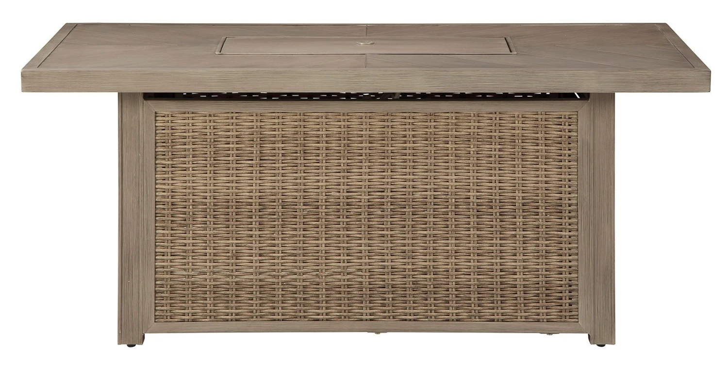 - OverviewTurn your backyard into a hotspot for entertaining with this Beachcroft fire pit table by Signature Design. Sporting an easy-on-the-eyes look inspired by driftwood, this fire pit table elevates the art of al fresco living. Chic chevron-patterned top is paired with all-weather resin wicker over rust-proof aluminum for beauty and brawn. Stainless steel burner with glass beads adds a captivating element sure to wow.
