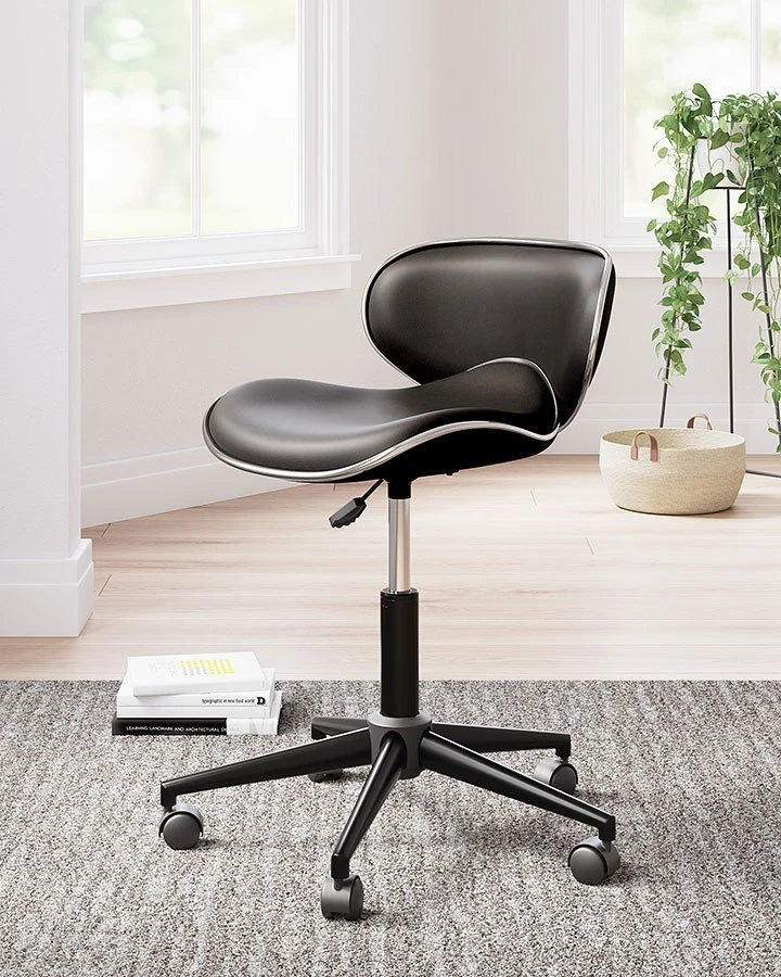 - OverviewThe finishing touch to any home office, this contemporary Beauenali Office Chair by Signature Design offers comfort and style. The chair features a cushioned seat and backrest with a clean contoured shape, trimmed with a brilliant chrome-tone metal finish. Upholstered in black faux leather, this chair pairs perfectly with any space.