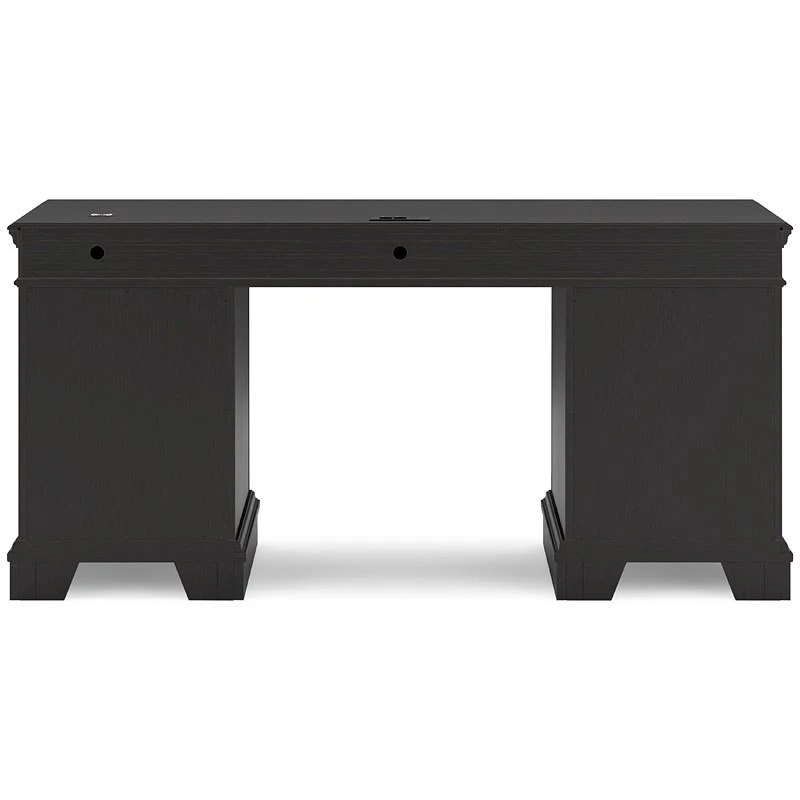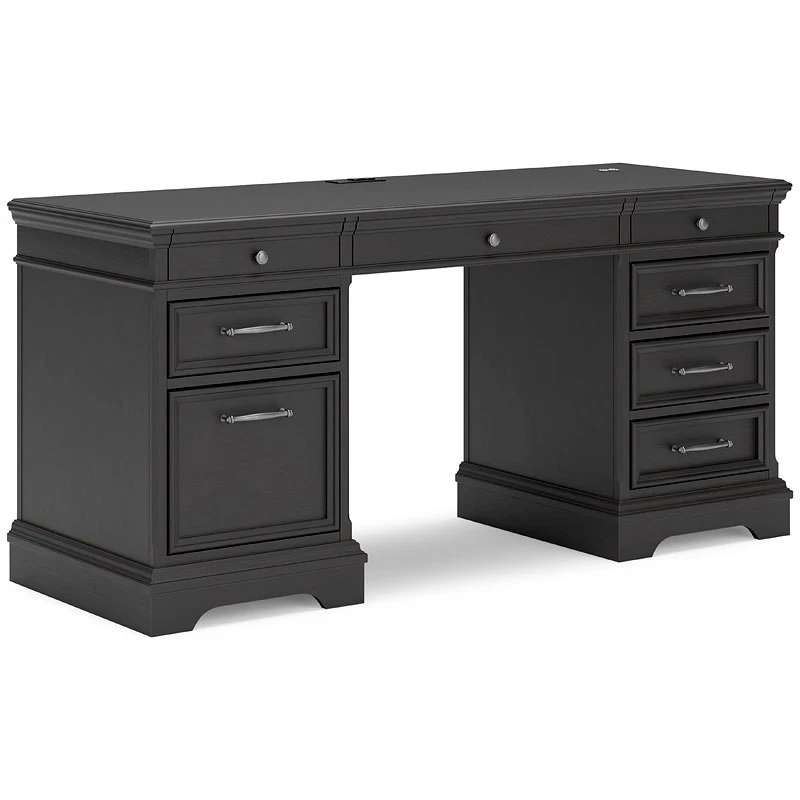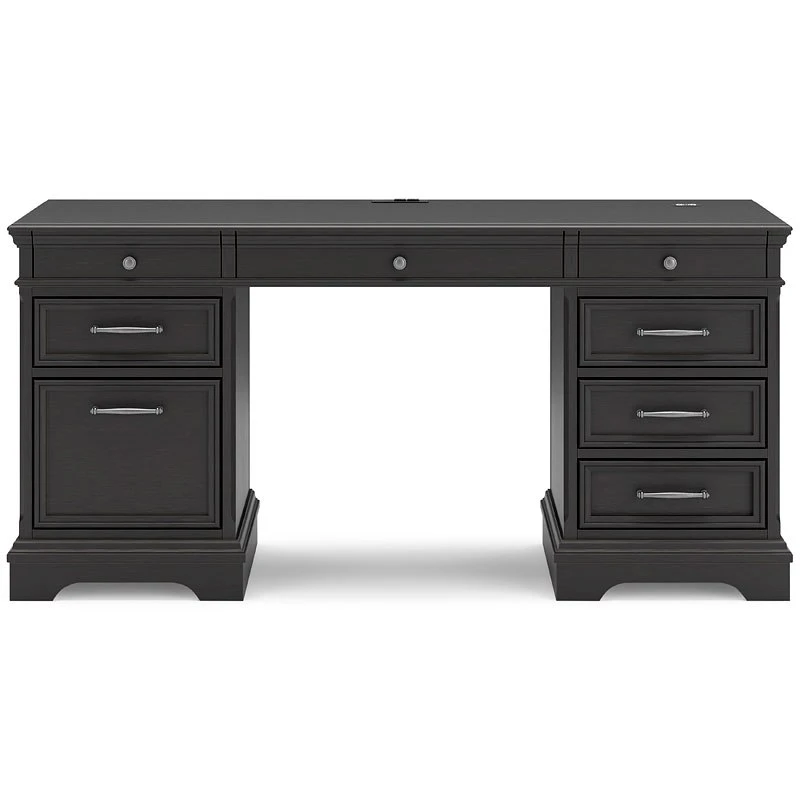 - OverviewMake a style statement with this Beckincreek credenza by Signature Design. Its traditional design is updated with an on trend vintage black finish. The credenza’s eight drawers, including a drop-front keyboard tray, add up to a well-organized workspace, while USB and wireless charging make staying productive that much easier.