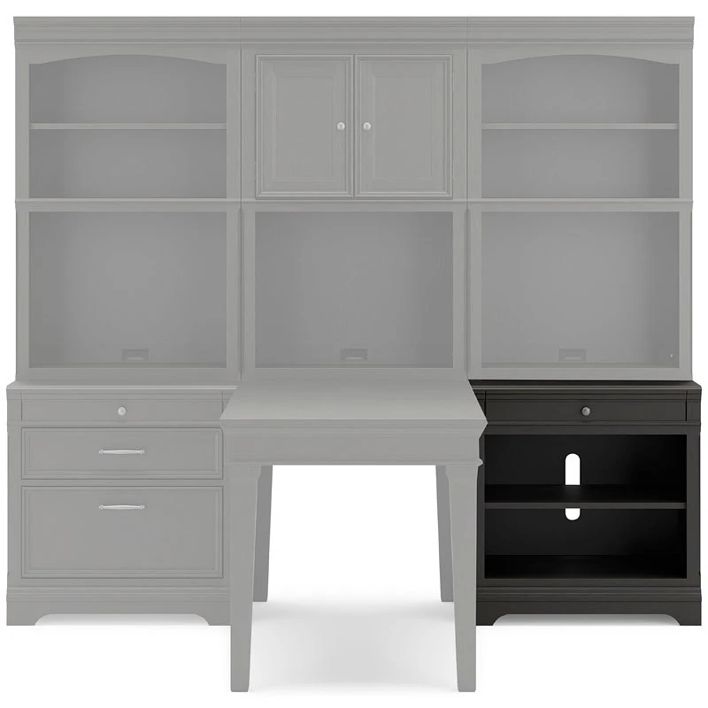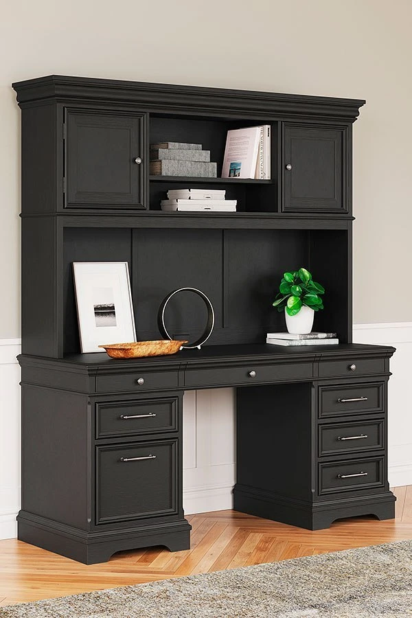 - OverviewMake a style statement with this Beckincreek Home Office Set by Signature Design. The 63″ desk connected to a wall unit with plenty of storage and display space. Its traditional design is updated with an on trend vintage black finish. The hutch with LED task light shines a light on those elusive reading glasses and other desktop items. Bookshelf, cupboard and cabinet space add up to a well-organized workspace, while USB and wireless charging make staying productive that much easier.