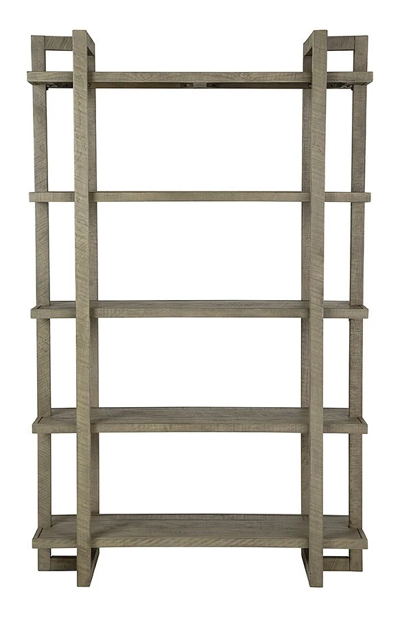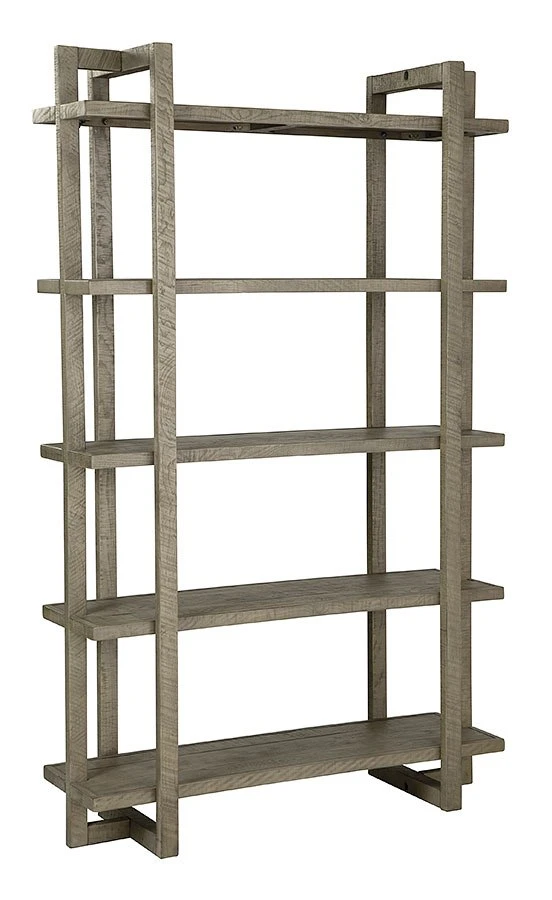 - OverviewClean-lined with an architectural attitude. This Bergton Bookcase by Signature Design offers a new take on relaxed refinery. Five shelves provide plenty of space for your personal library or decorative pieces. Dressed in a distressed gray finish, it suits a myriad of modern and casual color palettes.