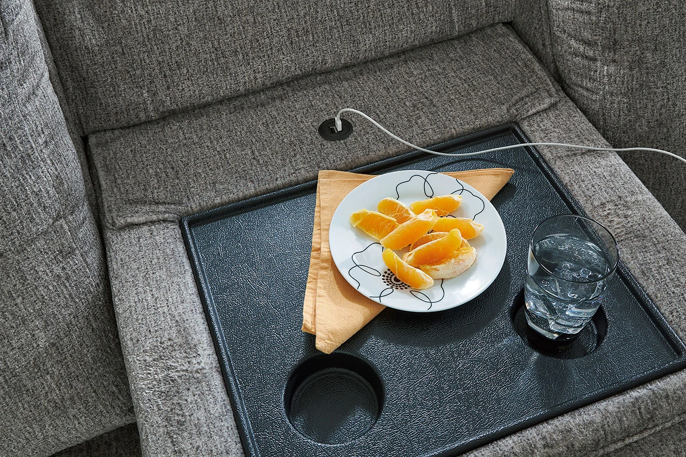 - OverviewMake your living room the ultimate hangout with this Bindura Sofa by Signature Design. Its buttery soft upholstery encourages you to lounge a while longer. And when it’s time to hit a peak state of relaxation, integrated cup holders and USB charging in the drop-down table keep all your essentials on hand. Comfortable, casual and contemporary, this sofa caters to the style you love and the function you crave.