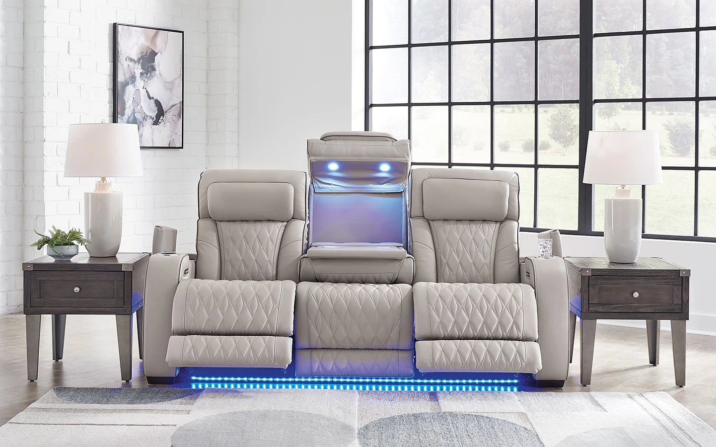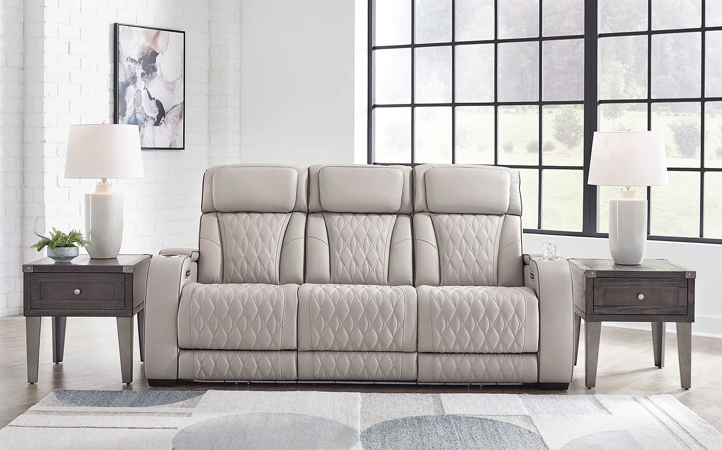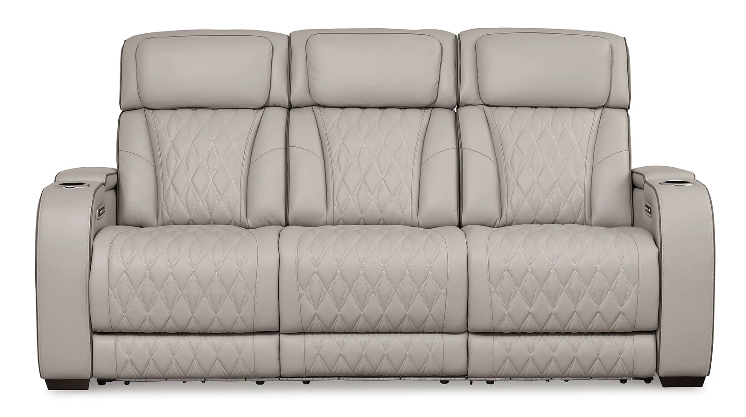 - OverviewReady to take your reclining experience to the next level? Then sit up and take notice. With this Boyington Power Reclining Sofa by Signature Design, ultimate relaxation is at your fingertips. Experience the pure bliss of an air massage system and heated seats at the touch of a button. The center seat is crafted with a drop-down table with power/USB plug-ins and dual cup holders. Plus the luxurious diamond-stitched upholstery is easy on the eyes, adding elegance to any space.