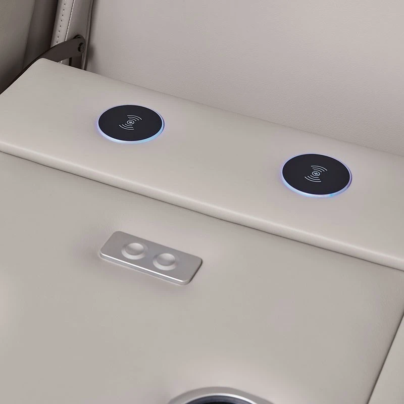 Drop-down table with LED reading lights, dual cup holders, 2 electrical outlets and USB and wireless charging