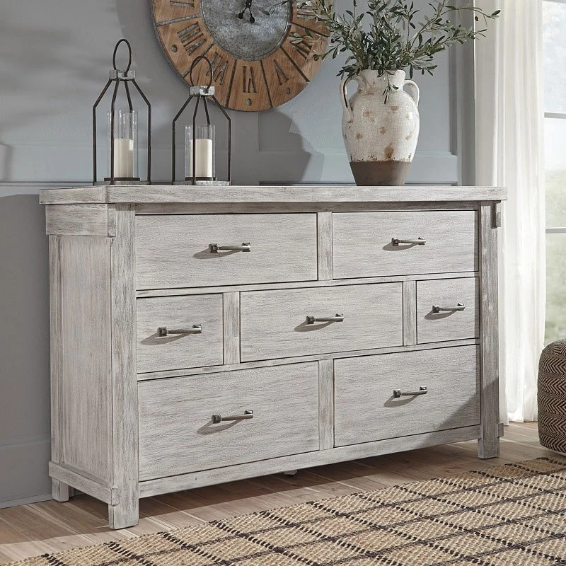 - OverviewThe Brashland dresser by Signature Design brings a fresh twist to the modern farmhouse movement. Handsome, hearty profile is made all the more interesting with a staggered drawer layout. Through-tenon styling incorporates a welcome touch of American craftsman. And the easy on the eyes, distressed white finish? Just the tone for a soothing, serene bedroom retreat.