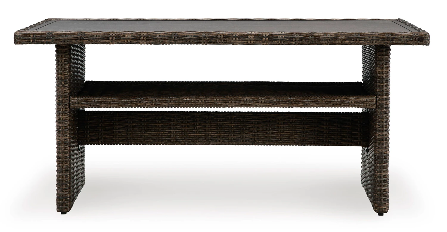 - OverviewRelax. Refresh. Refine your outdoor oasis. This Brook Ranch Outdoor Multi-Use Table by Signature Design masters high style with beautiful simplicity. A handy shelf for storage, warmly neutral hues and all-weather durability invite everyday use. From chic gatherings with guests to dinner by the pool with the kids, this sleek table makes outdoor living all the more enticing.