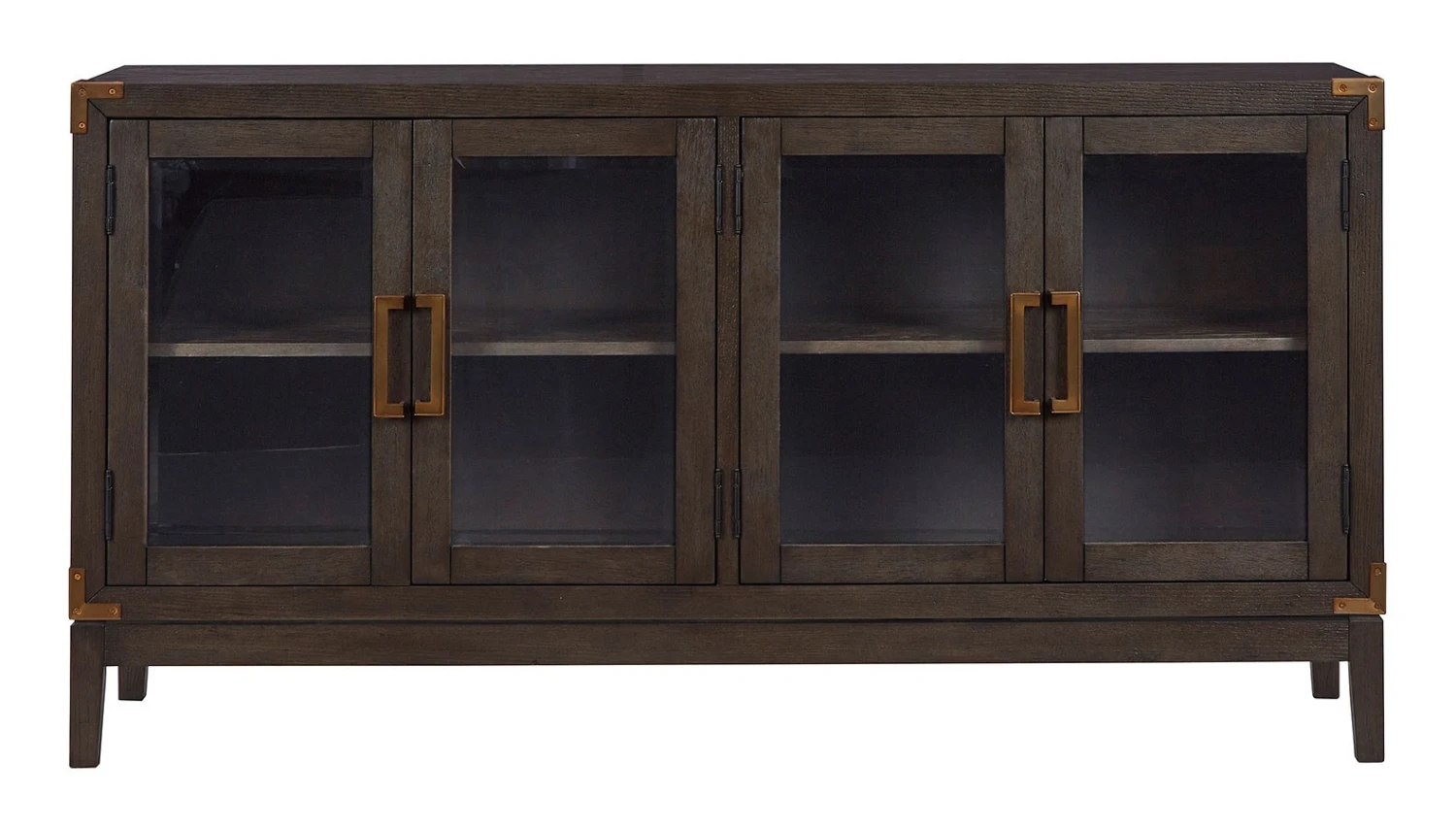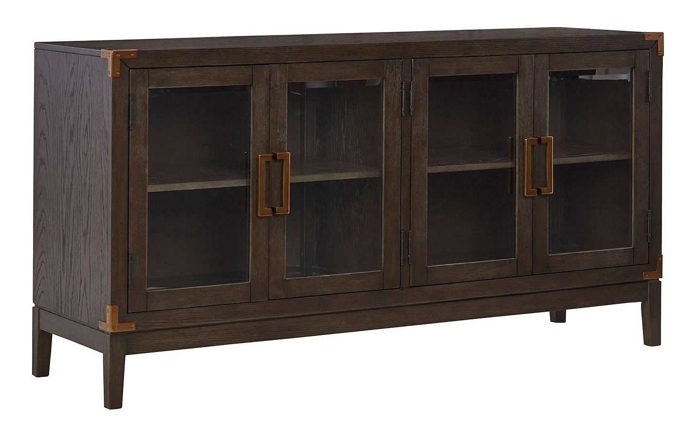 - OverviewDressed to thrill, this simply stunning Burkhaus dining server by Signature Design offers a high-design look at a down-to-earth price. Ultra sleek lines are accentuated with a dark waxy brown oak-tone finish that’s so easy on the eyes. Custom bar pulls on the double-door cabinets emphasize the server’s clean, modern lines, while their brass-tone finish and metal accents in the same coloration complete the upscale aesthetic. Beautiful inside and out, glass front doors showcase the adjustable shelving to create a display and storage piece with a timeless look that’s made to last.
