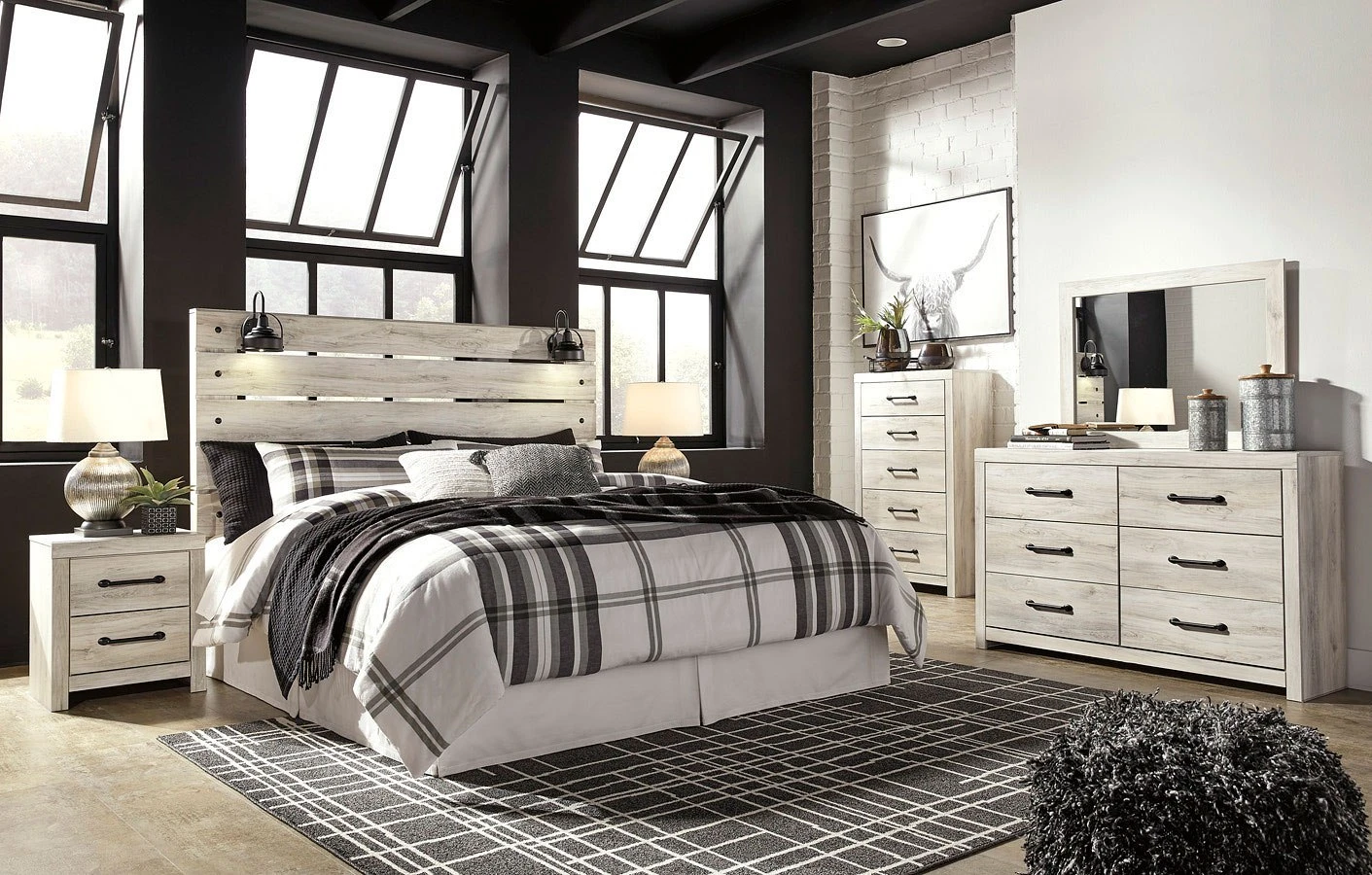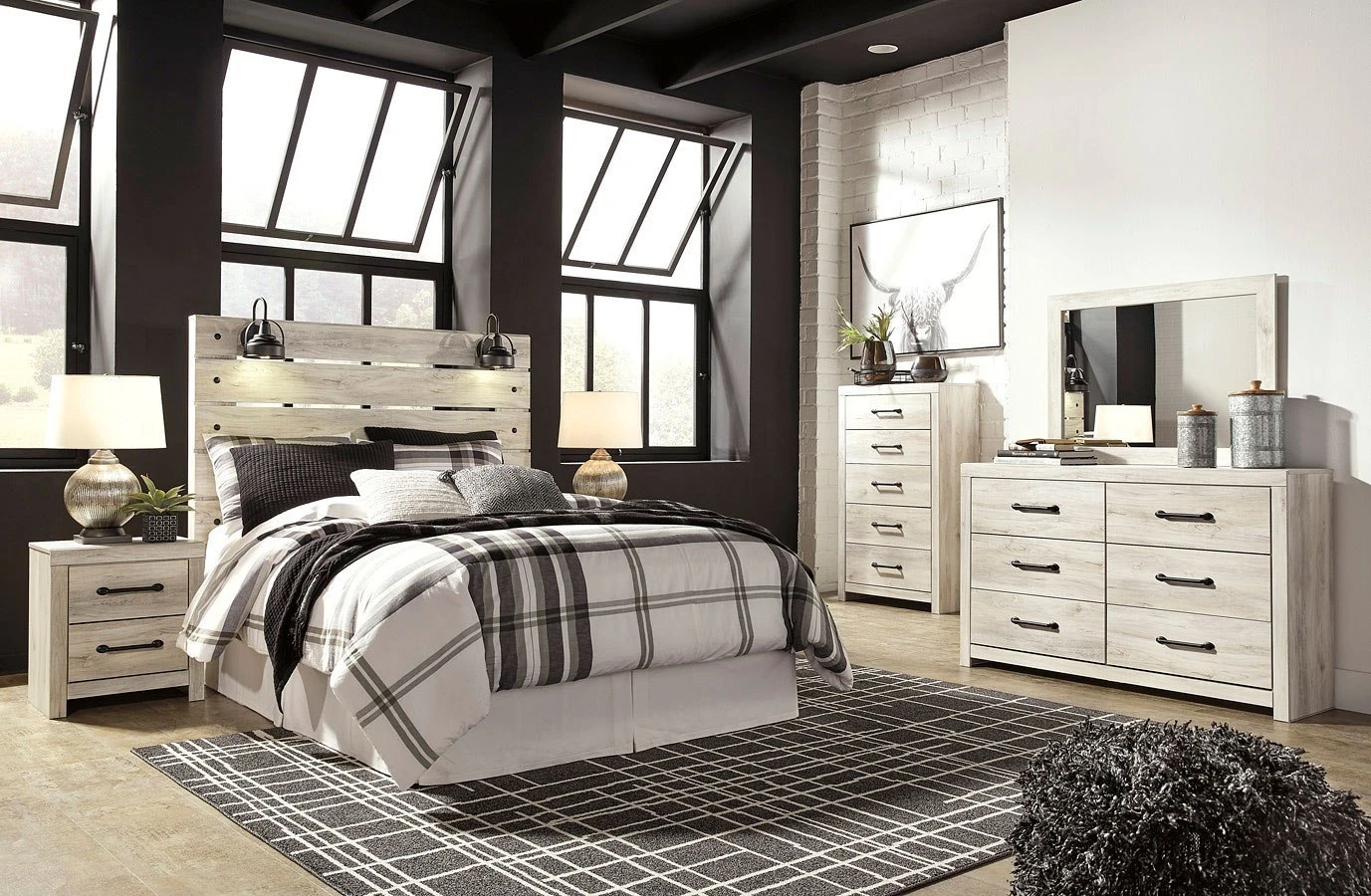 - OverviewWhat a delightful take on rustic industrial style. Whether modern loft or modern farmhouse, this Cambeck Bedroom Collection by Signature Design makes itself at home. The wispy whitewash palette enhances without covering the grain for that weathered look you crave. Love to read in bed? You’re sure to find the retro-chic light sconce and USB plug-ins on the open-slat style headboard such a bright idea.