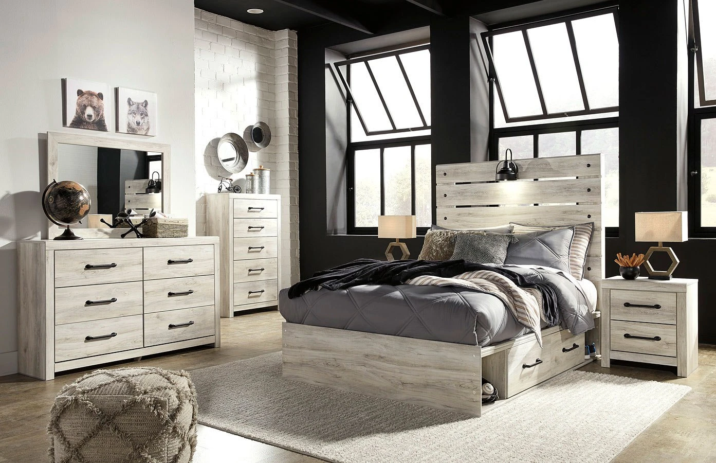 - OverviewWhat a delightful take on rustic industrial style. Whether modern loft or modern farmhouse, this Cambeck Bedroom Collection by Signature Design makes itself at home. The wispy whitewash palette enhances without covering the grain for that weathered look you crave. Love to read in bed? You’re sure to find the retro-chic light sconce and USB plug-ins on the open-slat style headboard such a bright idea.