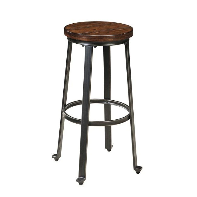 - OverviewThe rich rustic design of the Challiman Bar Tall Stool by Signature Design by Ashley Furniture features the Vintage Casual look of the deep brown finished chair seat accented with rough sawn details, beautifully supported with a bar shaped tubular metal base, bathed in a dark bronze color powder coat finish.