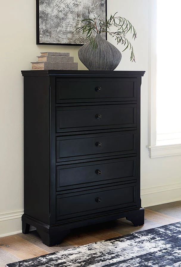 - OverviewThe traditional design of this Chylanta Chest by Signature Design has a timeless look that adds visual appeal to your bedroom, while its functionalism is equally impressive. There is lots of room for clothes and other essentials in five drawers with a stylishly subtle black finish. Creating a beautiful focal point, the drawer fronts are enhanced by round metal knobs in a dark bronze tone for a casual aesthetic.