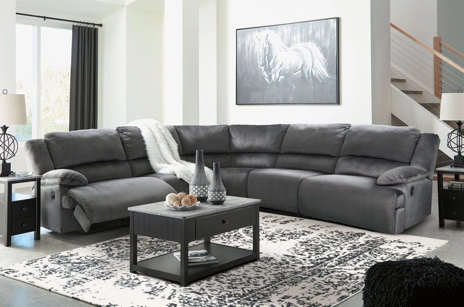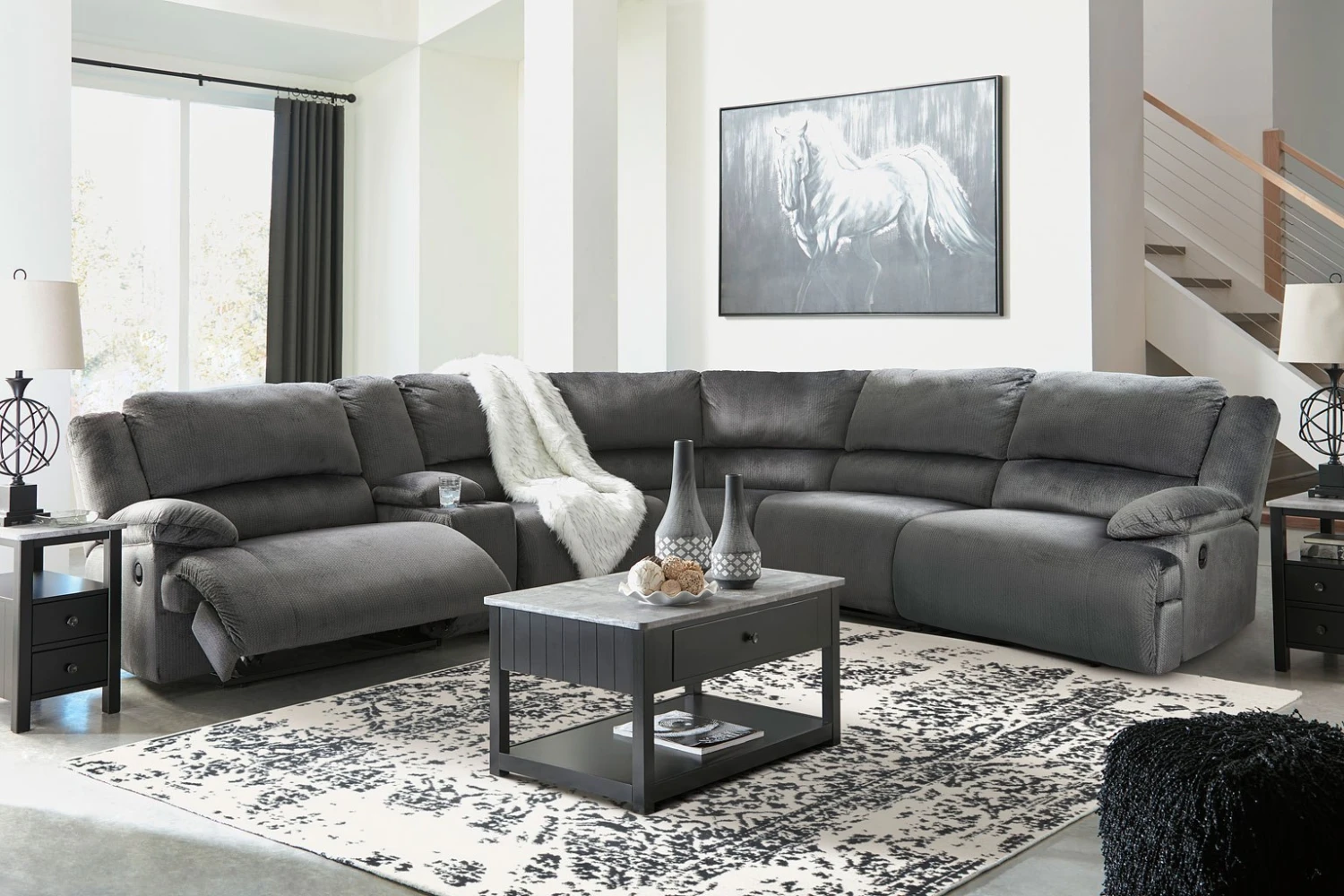 - Optional Items1 x Clonmel Charcoal Armless Recliner 1 x Clonmel Charcoal Armless Chair 1 x Clonmel Charcoal Console w/ Storage 1 x Clonmel Charcoal Wedge