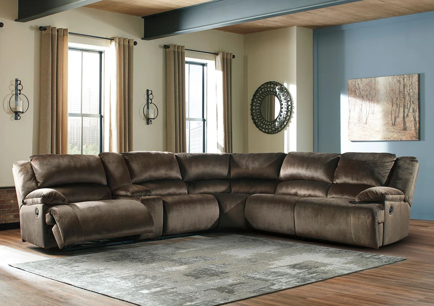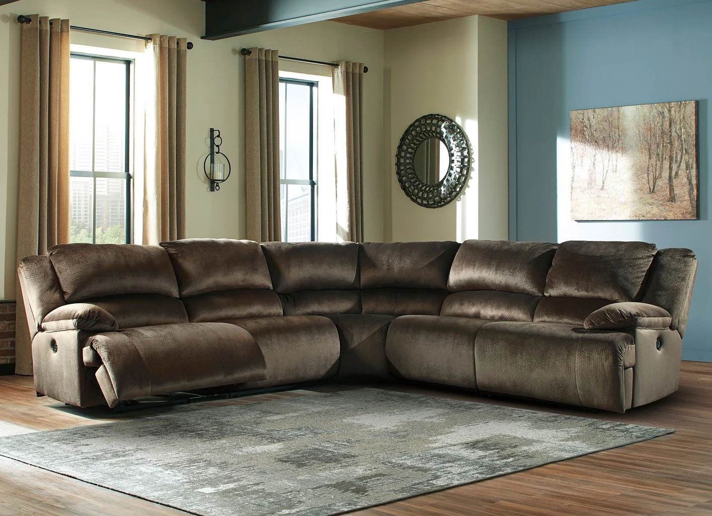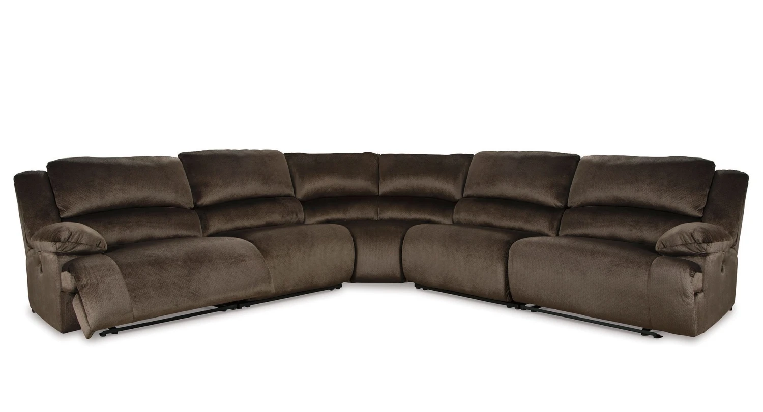 - OverviewLarge-scale comfort is yours with the Clonmel Reclining Sectional by Signature Design. With supremely padded back, seat and arm cushions, it’s the hero for ultimate relaxation. Microfiber upholstery is welcoming, soft and luxuriously covers the extra-wide seats. Recline back and kick up your feet to bolster your comfort level even more.
