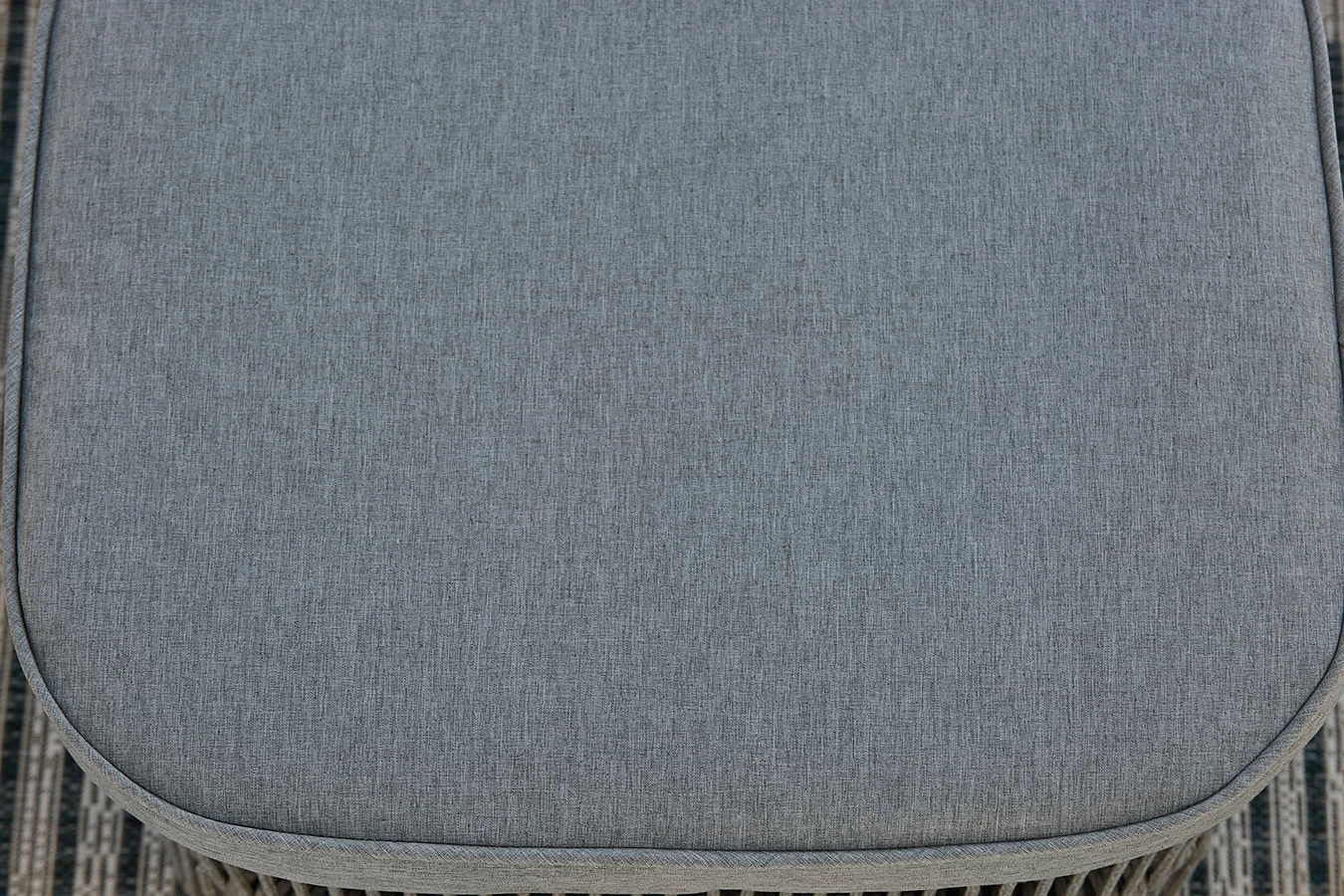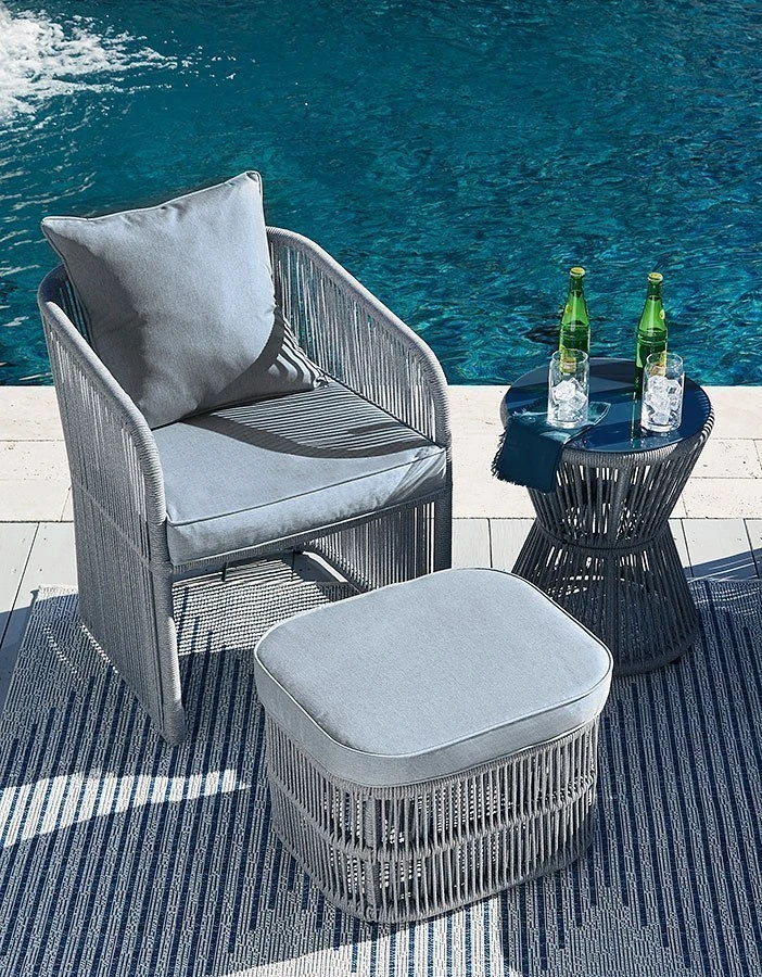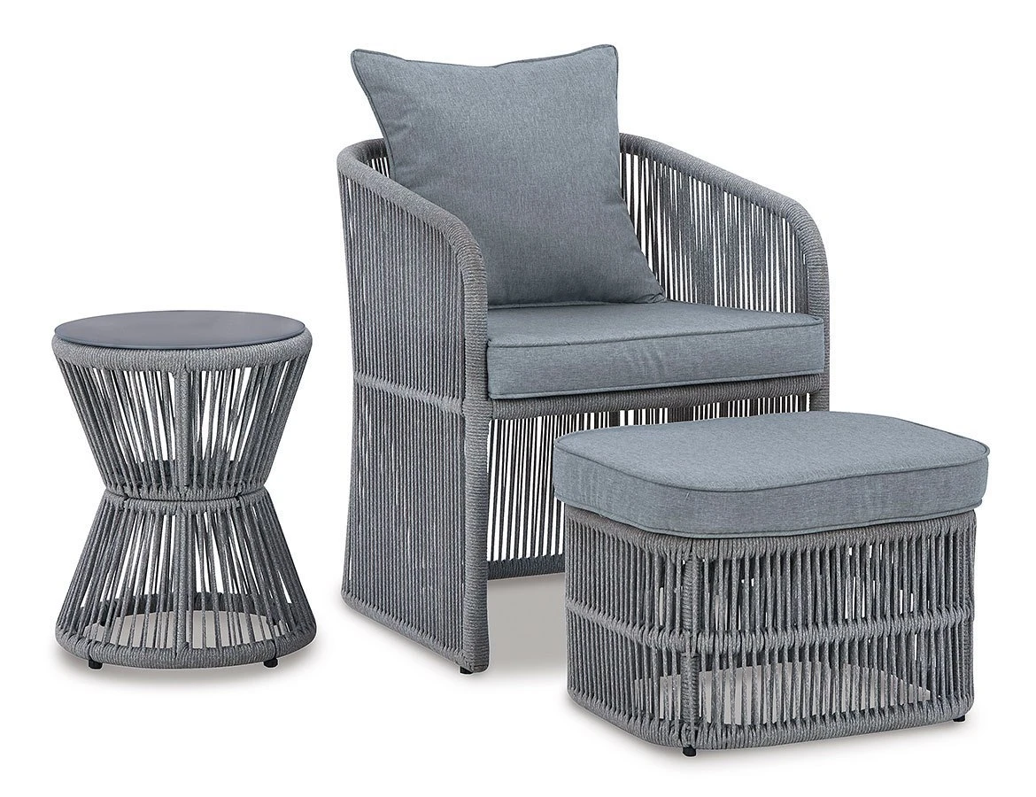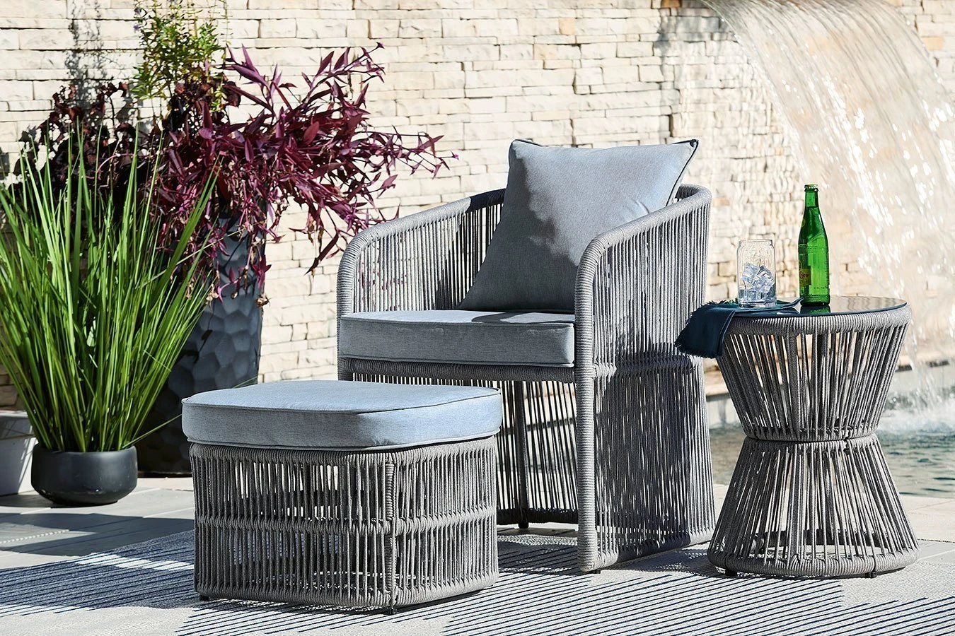 - OverviewOn-trend with its monochromatic design, this Coast Island outdoor chair with ottoman and side table by Signature Design is primed for casually cool relaxation. Gray rope material woven on a durable steel frame has a subtle-yet-dynamic sense of style. A tempered glass tabletop is the perfect place for drinks and snacks, while the self-storing ottoman offers a spot for tired feet to rest while you’re chilling alfresco. All-weather cushions, covered in easy-to-clean Nuvella fabric, round out the look.