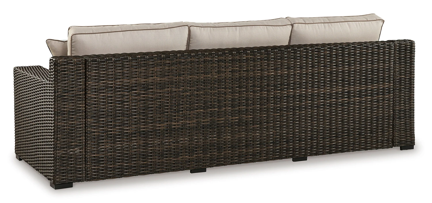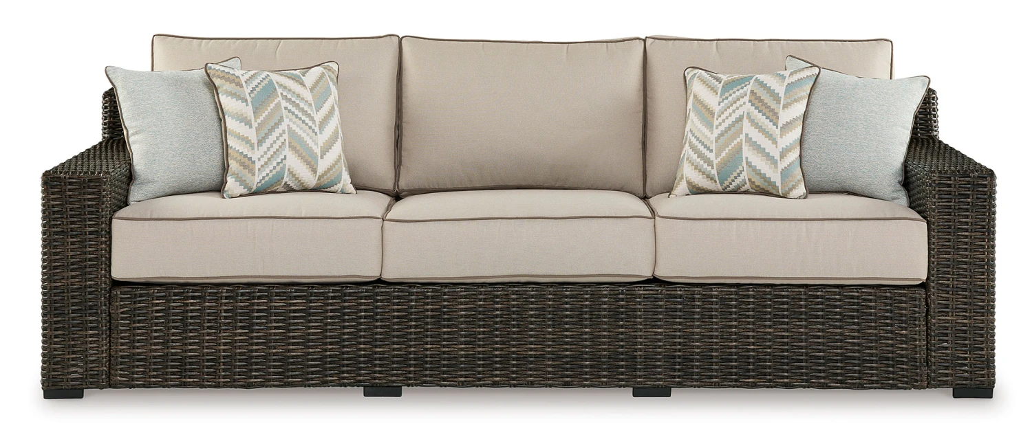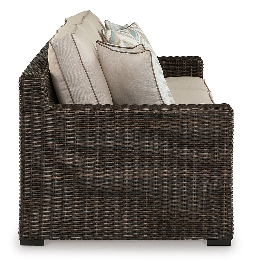 - OverviewWho says the great outdoors isn’t made for luxury living? This Coastline Bay Outdoor Sofa with cushion by Signature Design offers all the high-end design, plush comfort and durability you could ask for, and then some. Its all-weather, rust-proof aluminum frame provides the easy-breezy wicker look you love without the high maintenance. Rest assured, the high-performing Nuvella fabric covering the cushions and throw pillows is made to stand up to the elements.