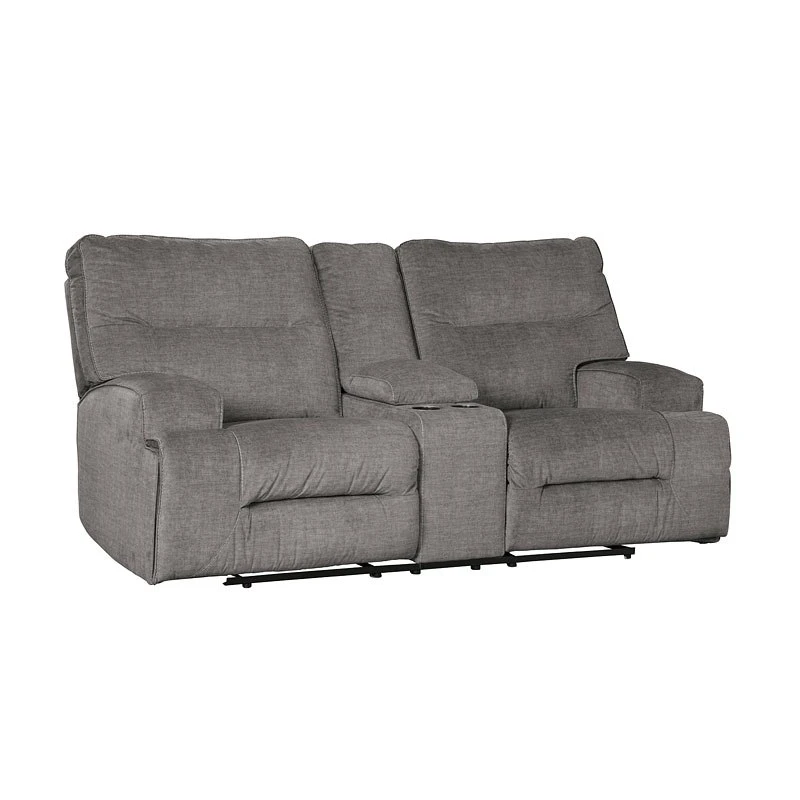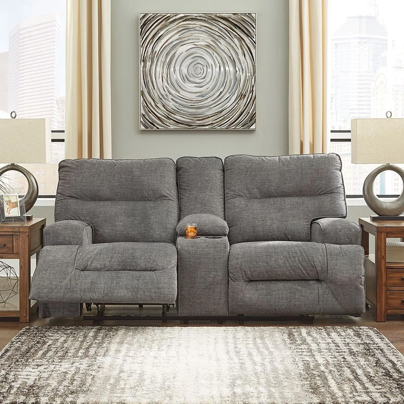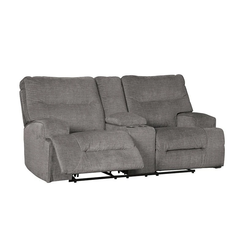 - OverviewThis Coombs Double Reclining Loveseat w/ Console by BenchCraft makes it hip to be square. Brilliantly boxy profile and wide track arms infuse a highly contemporary look you don’t often find in reclining furniture. Rest assured, the trendy charcoal-tone upholstery is sumptuously soft-and made all the more enticing with deep channel tufting for clean-lined flair. Dual cup holders and storage in the center console are a mighty handy touch.