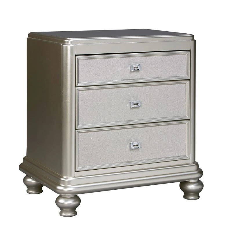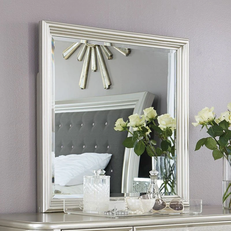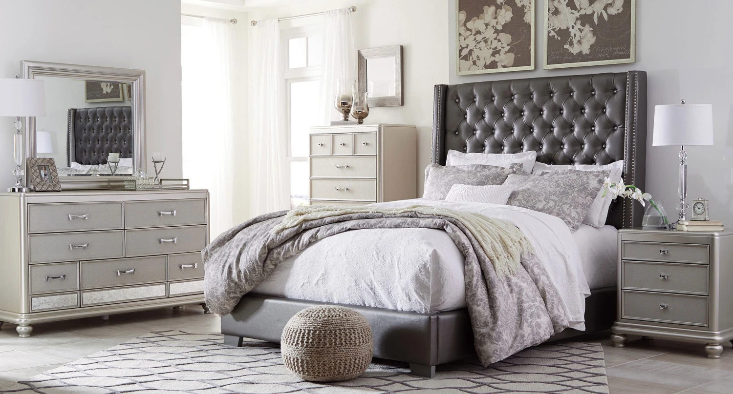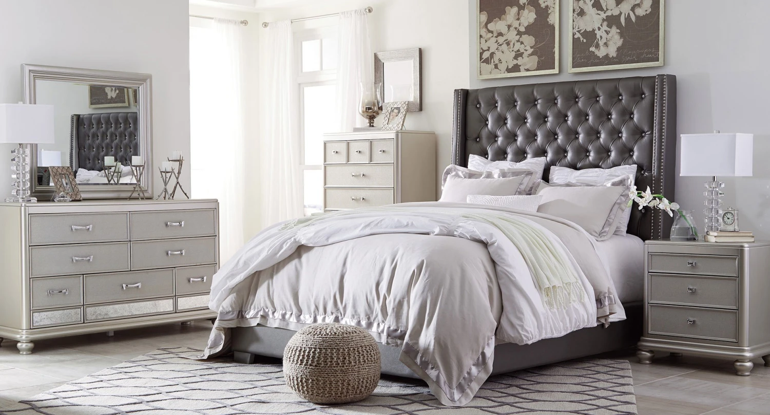 - OverviewThe Coralayne Bedroom Set by Signature Design allures with the glitz and glam befitting silver screen queens. Exquisite frame’s metallic tone channels that Hollywood Regency flair you’ve been dreaming of. Faux shagreen texturing on the drawer fronts, a touch of bejeweling on the sculptural pulls and a strip of mirror sheen elevate Coralayne to interior fashion’s A list. Tall upholstered bed with faux diamond tufting and gray textured PVC cover.