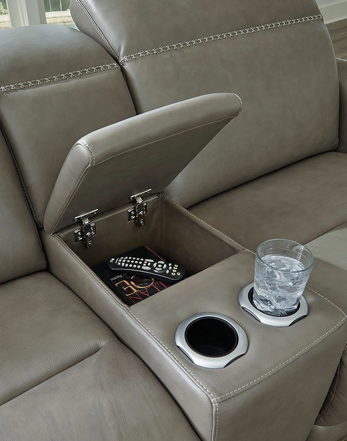 The zero-wall power reclining mechanism features infinite positions for comfort and a USB charging port in the control
