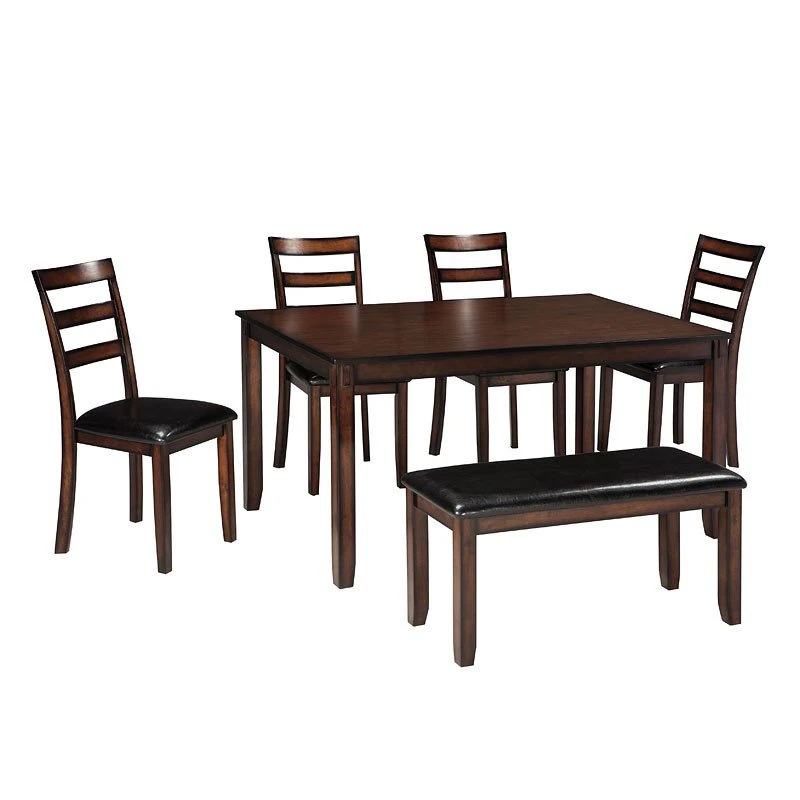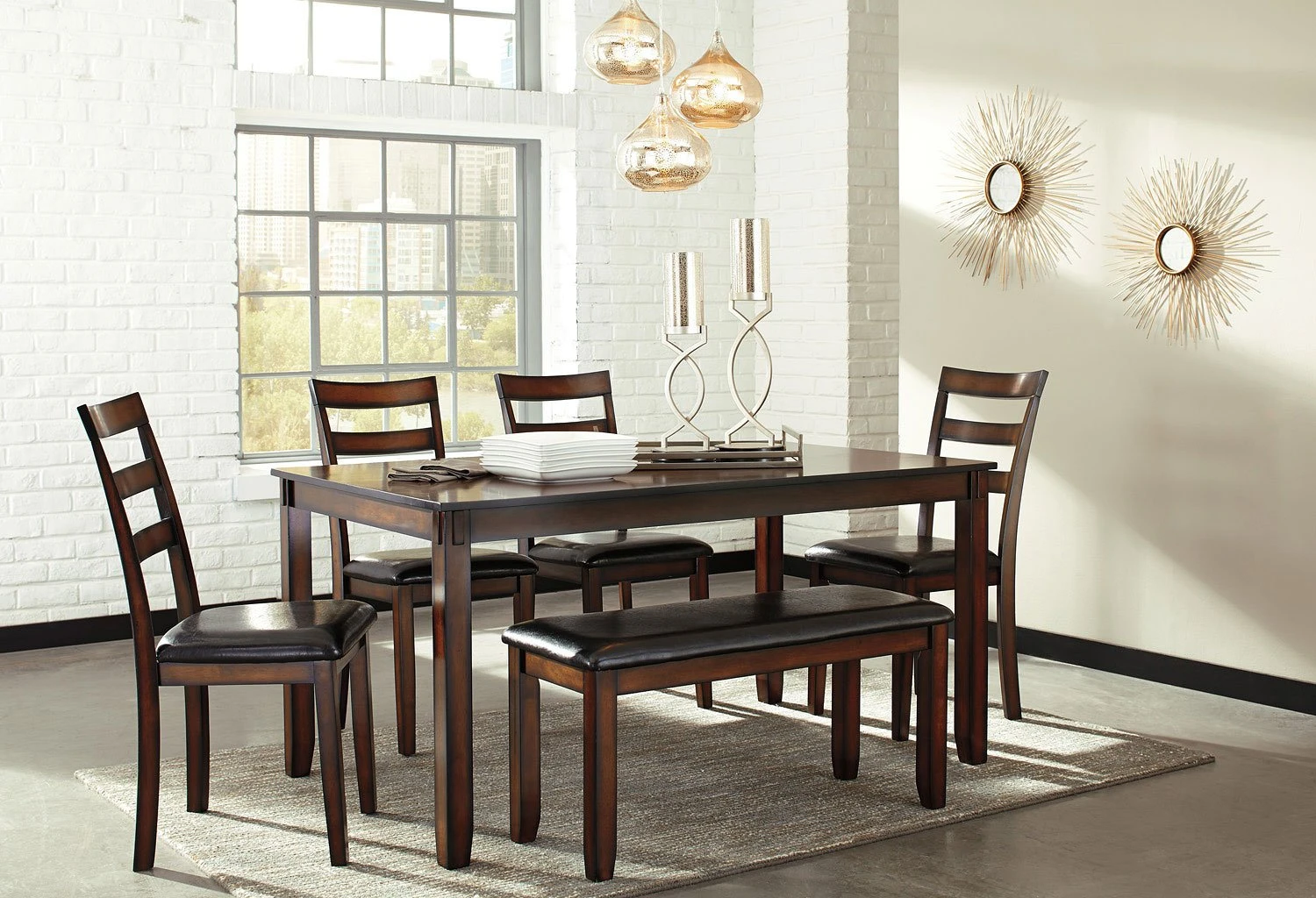 - OverviewFeast your eyes on how beautiful simplicity can be. The Coviar 6-Piece Dining Room Set by Signature Design has a wonderfully clean-lined profile and is dramatically enriched with a complex, burnished finish, loaded with tonal variation and rustically refined character. Upholstered ladder back chairs are such a classic, while comfortably cushioned bench brings a modern sensibility to the table.