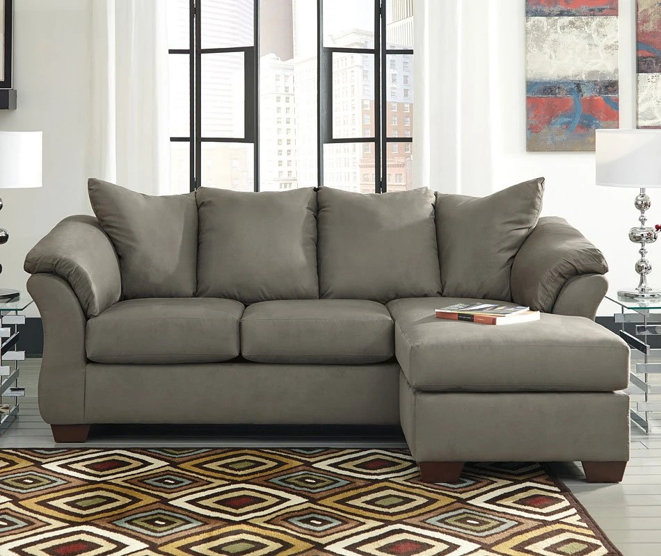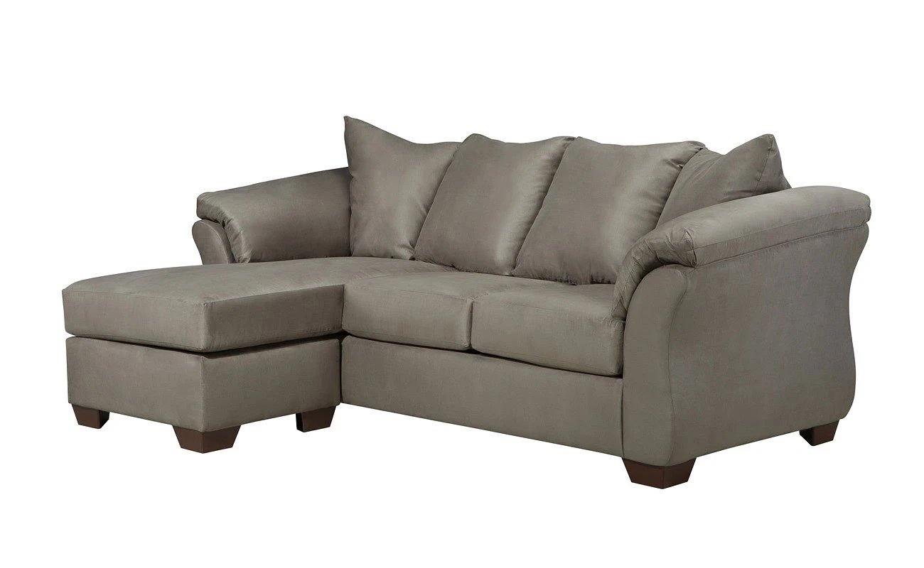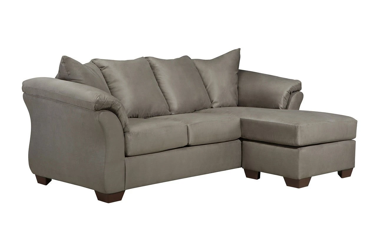 - OverviewTalk about fine lines and great curves. That’s the beauty of the Darcy Cobblestone Sofa Chaise by Signature Design – made to suit your appreciation for clean, contemporary style. A striking flared frame, comfy pillow top armrests and an ultra-soft upholstery that holds up to everyday living complete this fashion statement. Versatile chaise has a reversible cushion and can be used on right or left arm side.