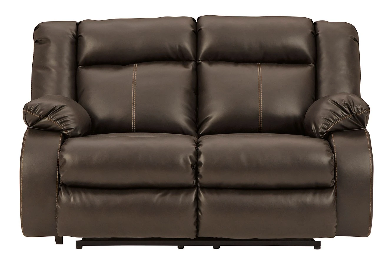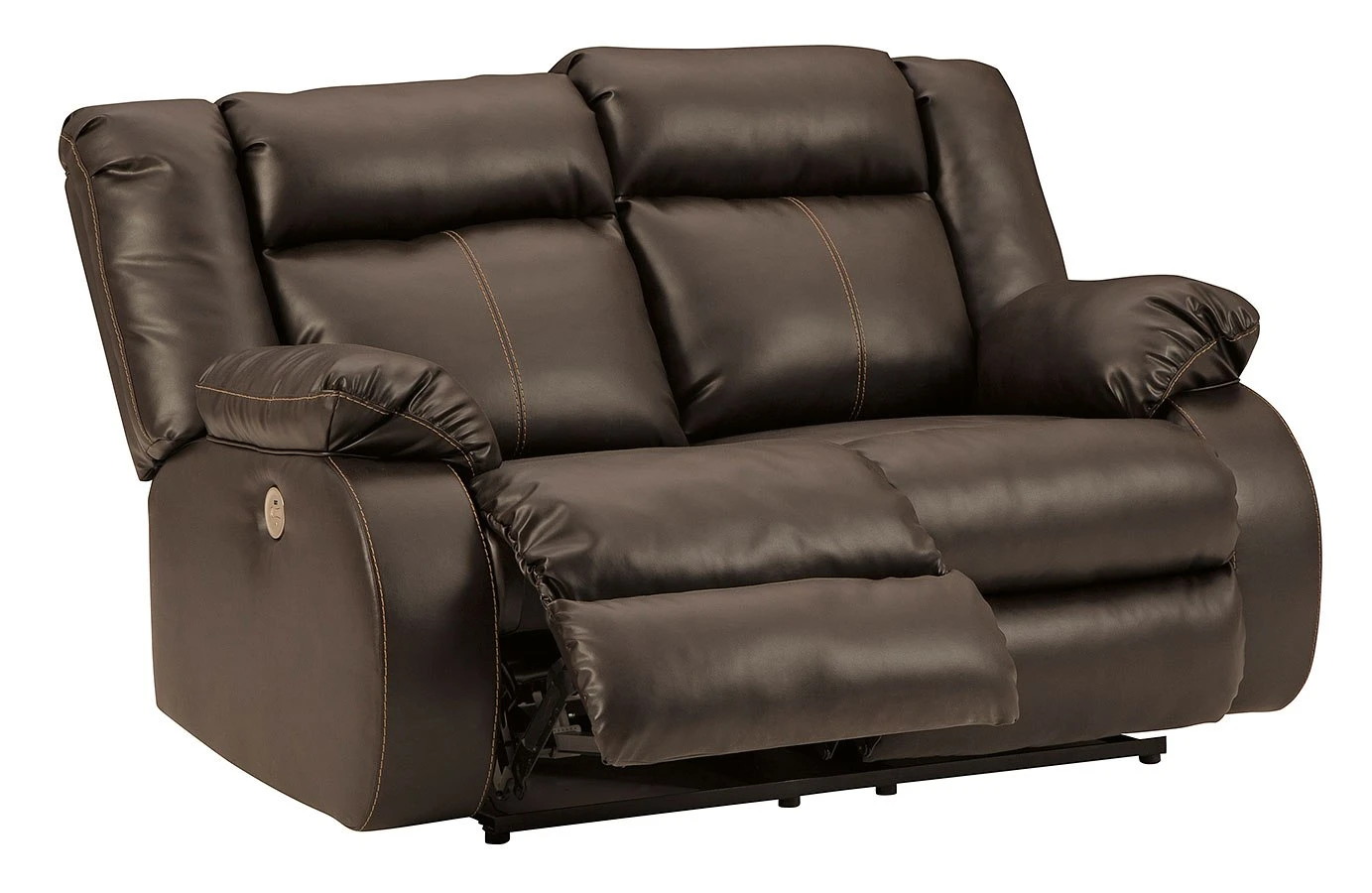 - OverviewIf highly contemporary looks and a heavenly feel sit well with you, rest your eyes on this Denoron reclining power loveseat by Signature Design. Decadently soft, the easy-care faux leather upholstery is enriched with jumbo contrast stitching and dramatic cut-and-sew lines for fashion-forward flair. Radius cut arm frame adds cool, curvaceous interest. At your fingertips: one-touch power control with a zero-draw USB plug-in that’s not only convenient but also energy efficient. When it comes to high style at a down-to-earth price, this power reclining loveseat really brings it home.