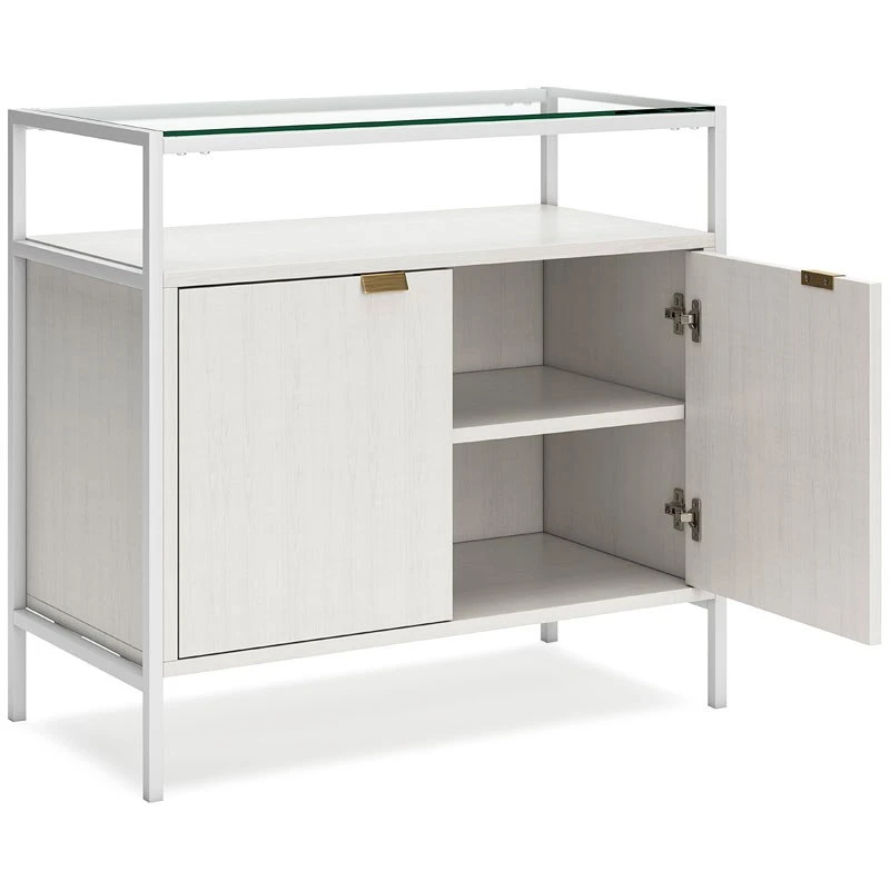 - OverviewBring your vision of a modern home workspace to life with this sleekly designed Deznee small bookcase by Signature Design. Its linear construction and white finish keep things minimal, while goldtone hardware on the double-door cabinet adds subtle refinement. An open shelf and glass top round out the versatile, striking bookcase.