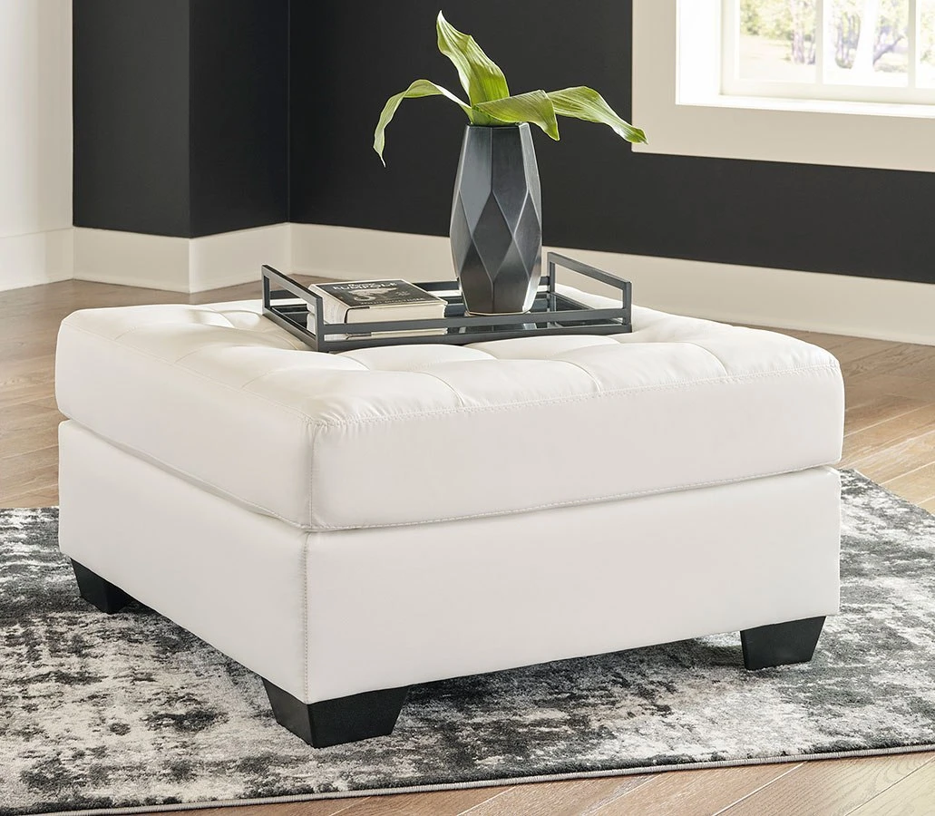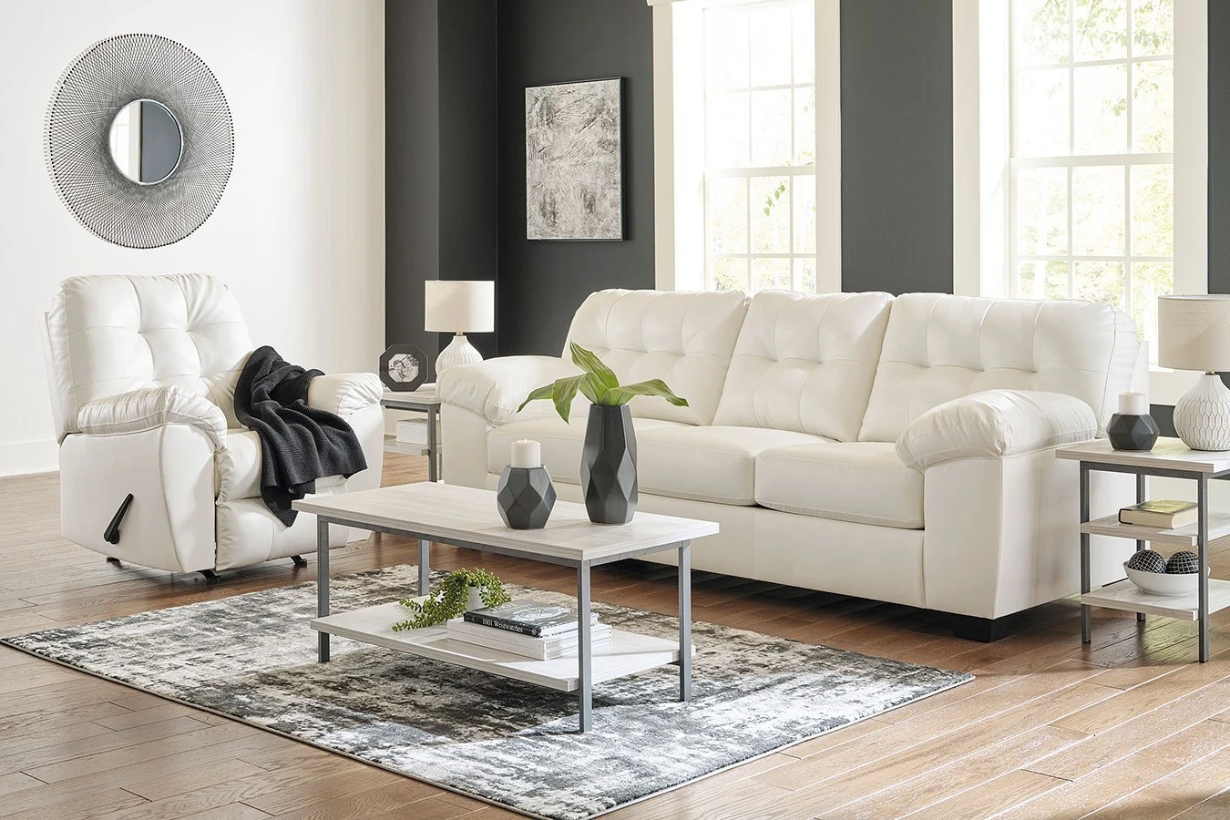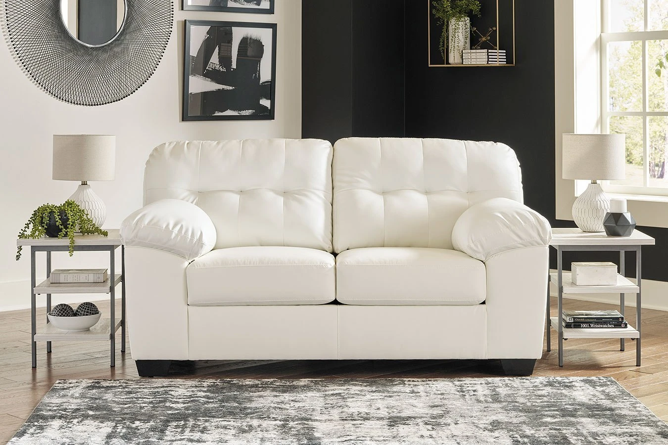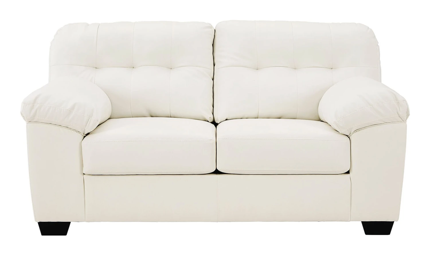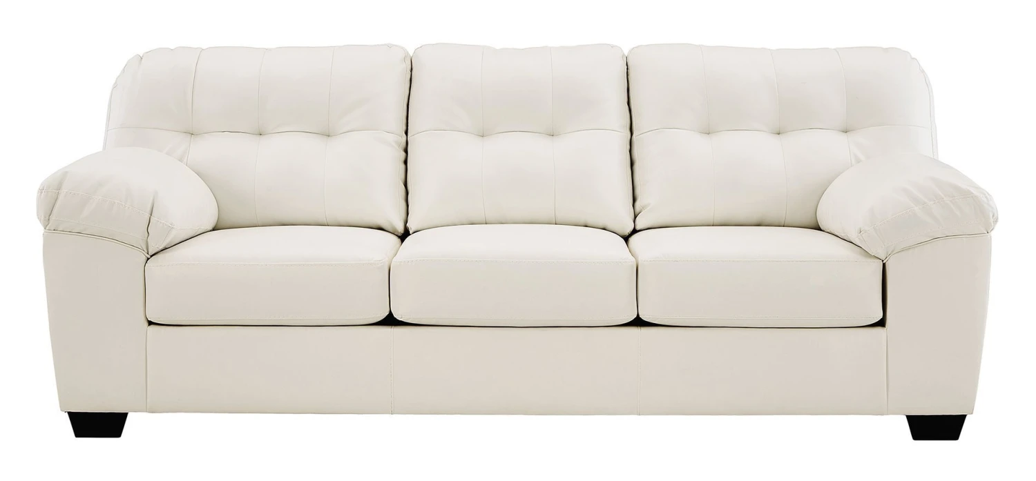 - OverviewDressed in glorious white faux leather, this Donlen sofa by Signature Design is certain to be the center of attention. With tasteful tufting, padded armrests and a sleek tapered design, it combines style and comfort. This sofa’s generous scale lets you kick back and relax at home solo or when hosting friends.