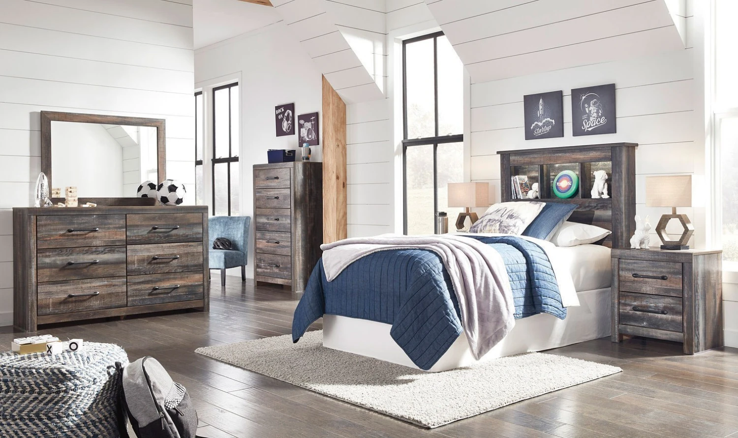 - OverviewWhen merged in just the right way, rustic and industrial styles can make one happy marriage. Case in point: this Drystan Bedroom Collection by Signature Design. A refined take on barn board beauty, its complex, replicated wood grain showcases hints of burnt orange and teal tones for a sense of weatherworn authenticity.