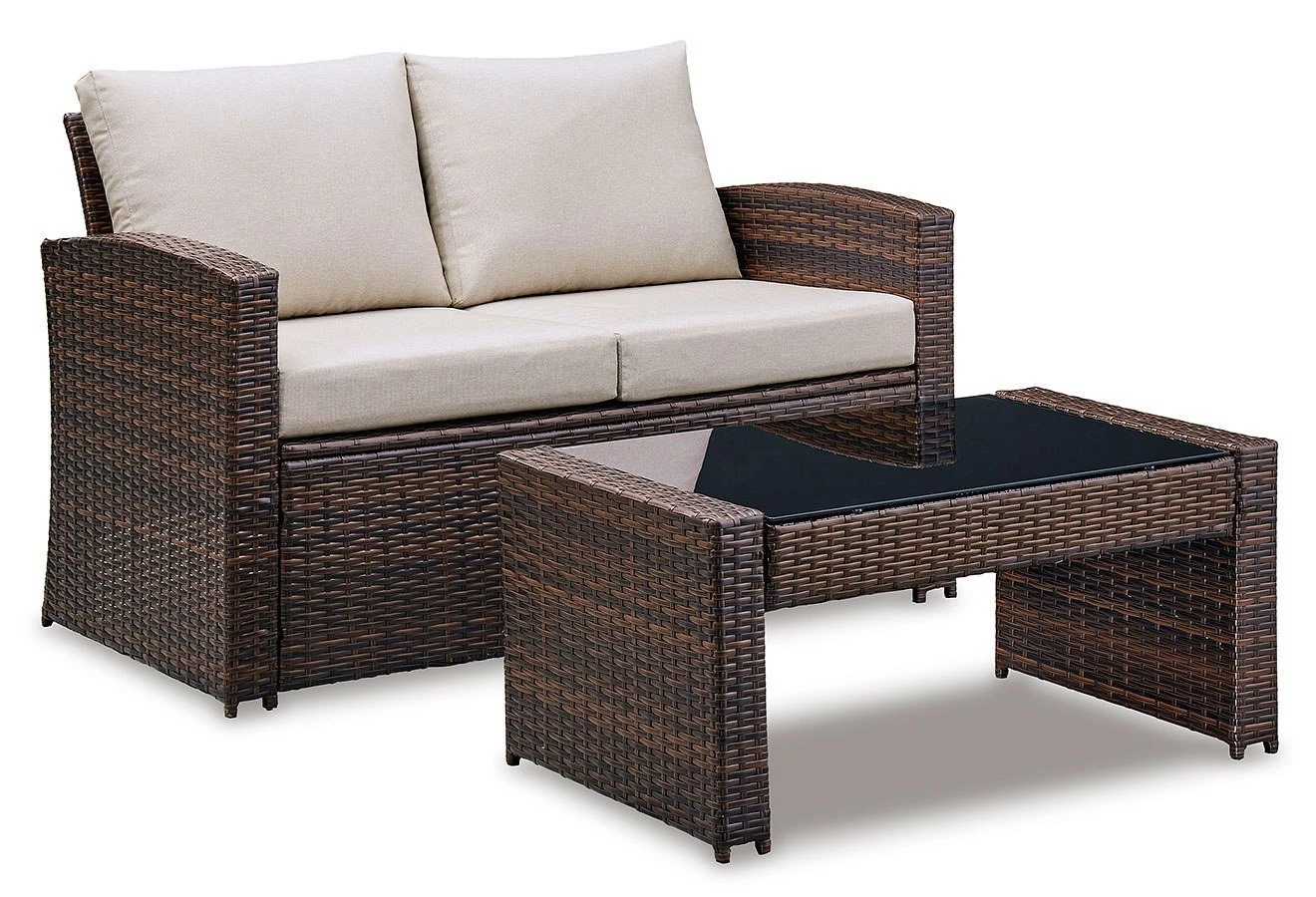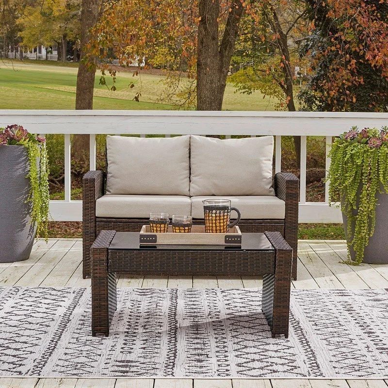 - OverviewComplete your outdoor oasis with this East Brook loveseat with coffee table set by Signature Design. A dark brown resin that’s wicker woven on a heavy-duty steel frame keeps your patio perfectly stylish, with the added bonus of durability. The neutral-colored cushions blend seamlessly with your other outdoor decor and are made with our high-performance Nuvella fabric that’s fade-resistant, stain-resistant and a breeze to clean.