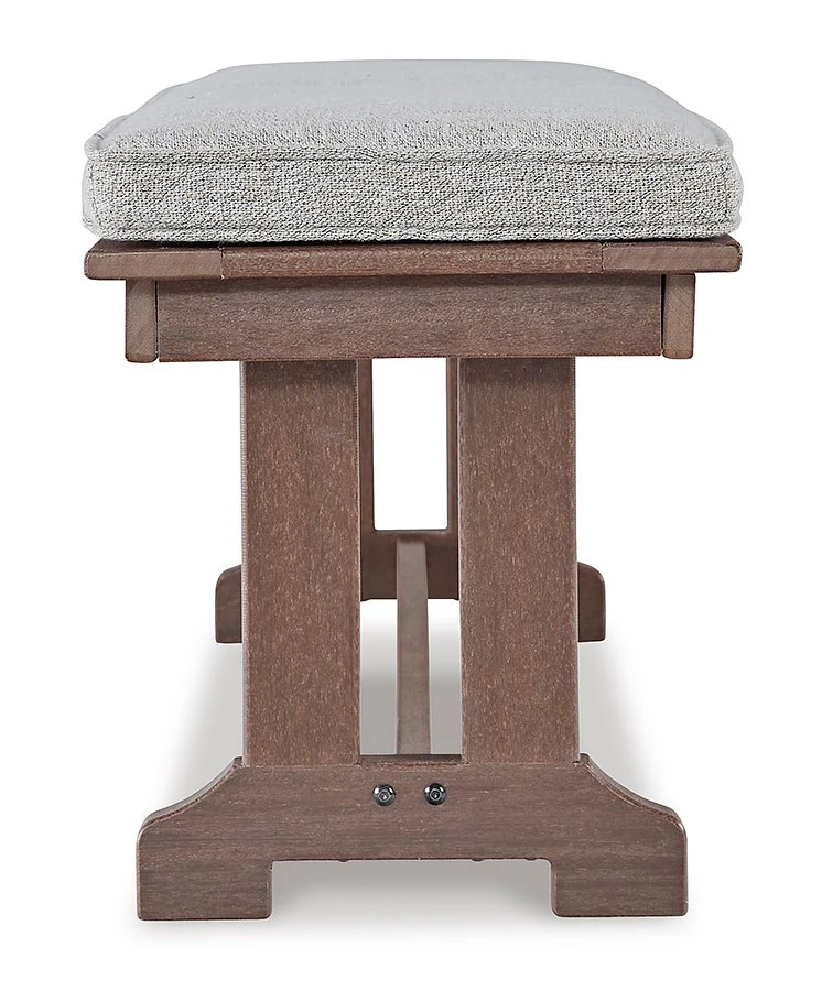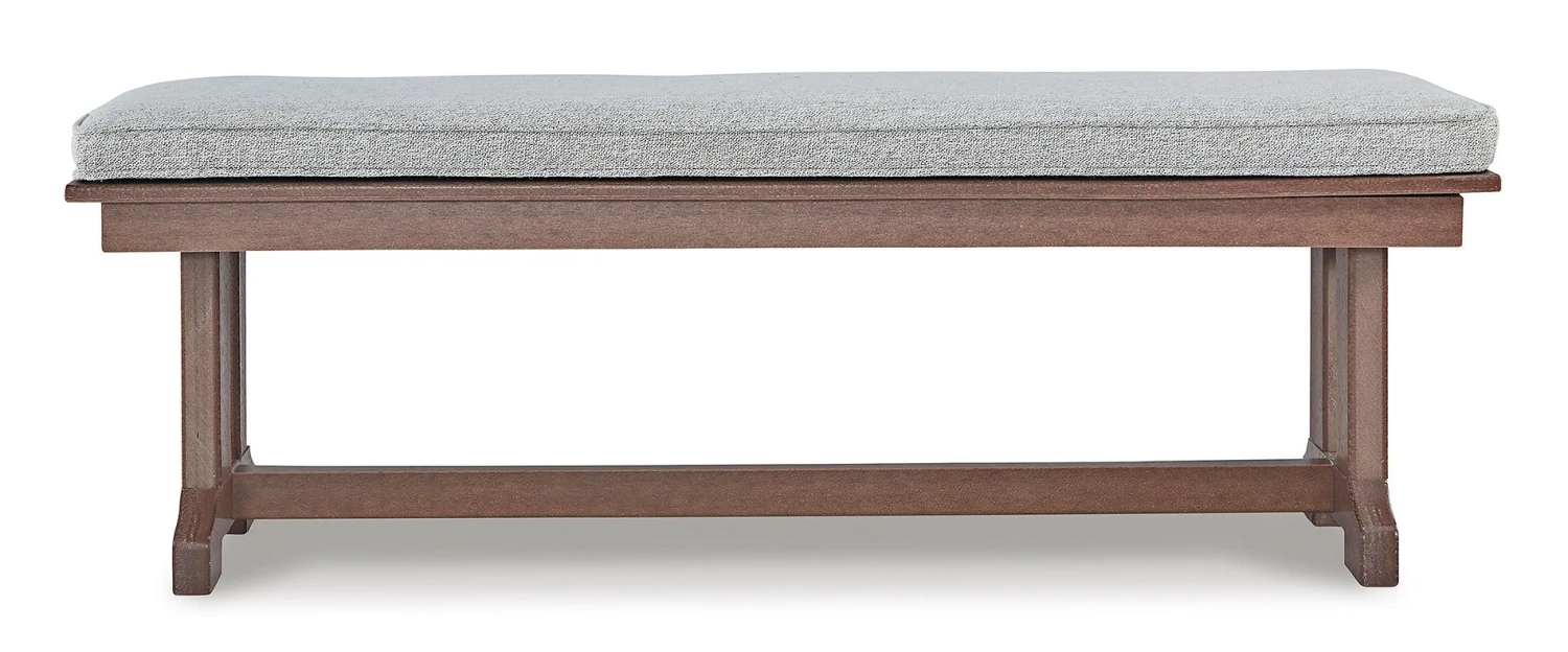 - OverviewGet back to nature with the relaxed styling of this Emmeline Outdoor Bench by Signature Design. Crafted of MEGA TUFF HDPE material, it combines the exceptional durability and weather resistance you need with the “wood look” you love. Rest assured, the cushion is wrapped in comfortable and carefree Nuvella fabric, leaving you plenty of time to sit back and smell the roses.