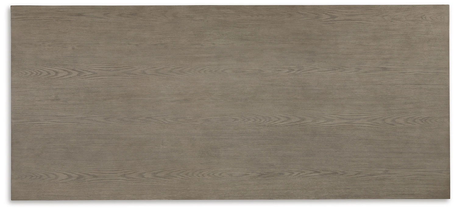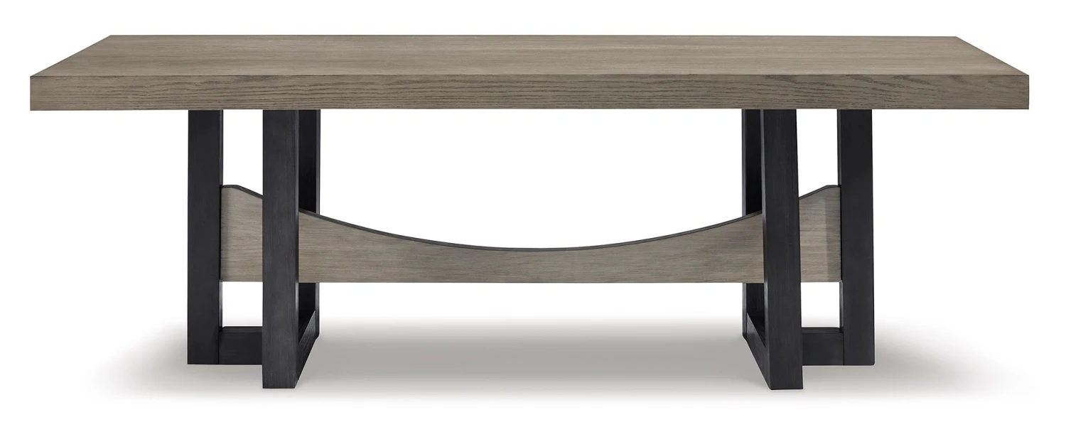 - OverviewThis Foyland dining room table by Signature Design is casual contemporary style simply done right. Its two-tone color scheme features a rich brushed black main color accented with a beautiful dusty grayish brown wood tone. The table’s contemporary trestle base design offers steady support for the rectangular top while encouraging guests to gather about.