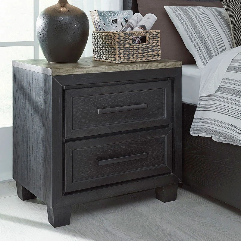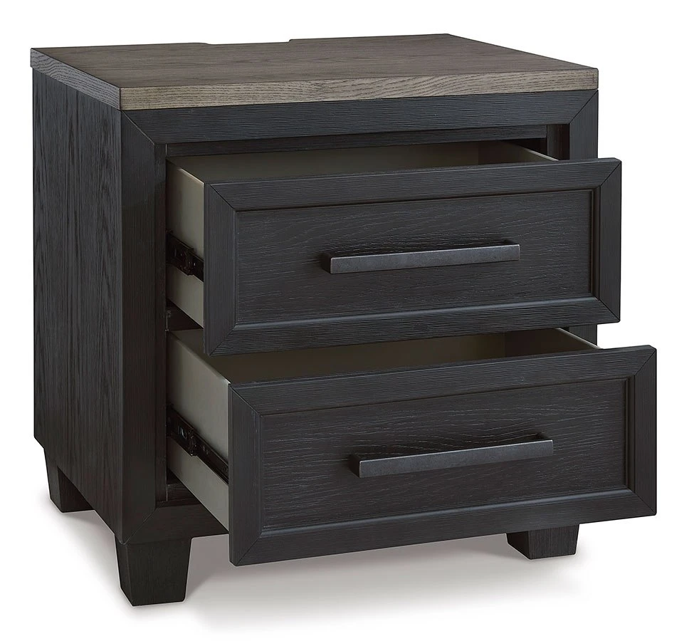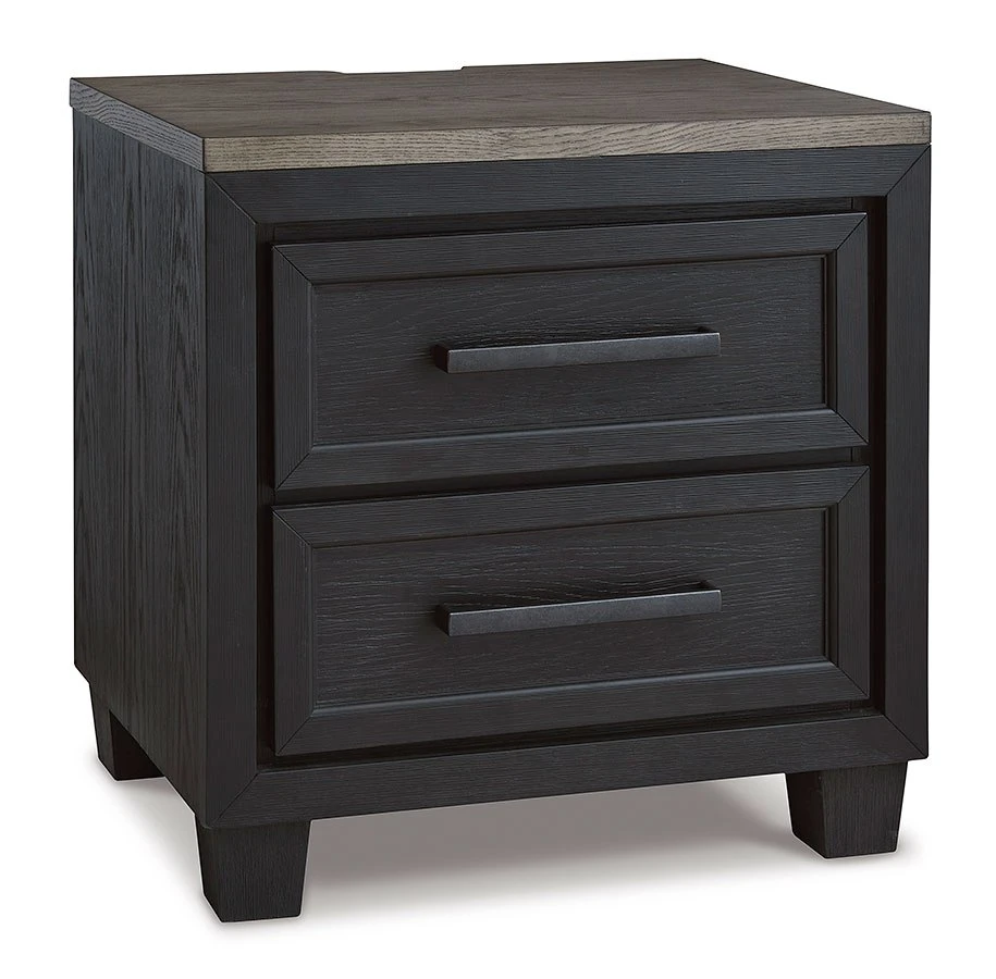 - OverviewThis Foyland nightstand by Signature Design is casual contemporary style simply done right. Its two-tone color scheme features a rich brushed black main color accented with a beautiful dusty grayish brown wood tone. Two drawers with sleek black pulls offer plenty of storage for your bedside essentials. The nightstand marries tech and clean-lined design, with a dual USB charging port along the upper back edge to keep your devices powered all evening long.