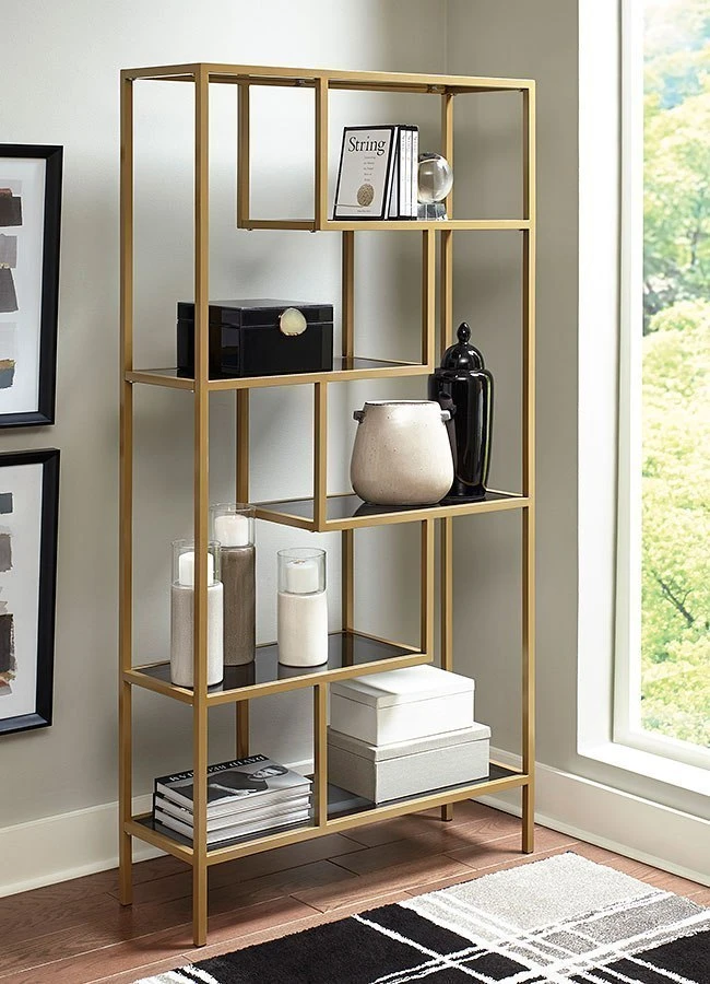- OverviewSimple structures make for the coolest designs. This bookcase builds on its architectural bias with offset shelves to create a dynamic display in your space. With goldtone finished metal and gray tinted glass, this piece creates a sophisticated and modern silhouette to elevate any urban-inspired space.